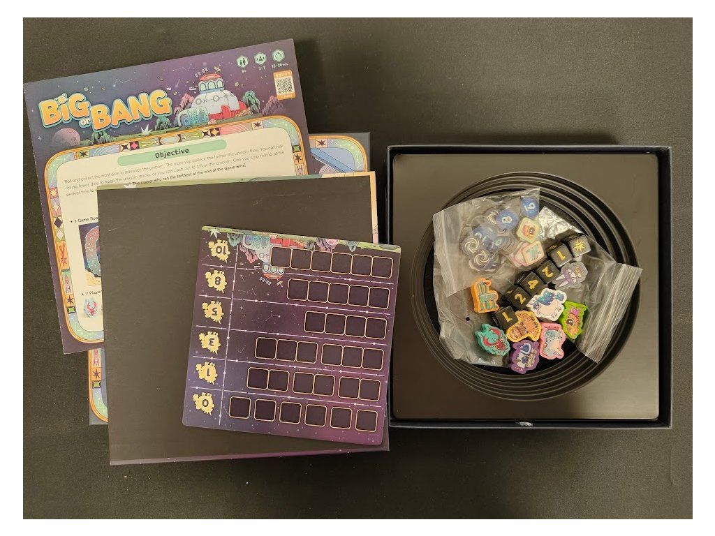 Ve hře Big or Bang hráči závodí po kosmické dráze a honí rychle se pohybujícího jednorožce. V této hře, kde zkoušíte štěstí, máte za úkol házet kostkami, abyste posunuli jednorožce vpřed. Každý úspěšný hod posune jednorožce dál, ale jelikož vyhozené kostky se pokládají na podložku a nelze je házet znovu, riziko „prohry“ se zvyšuje.