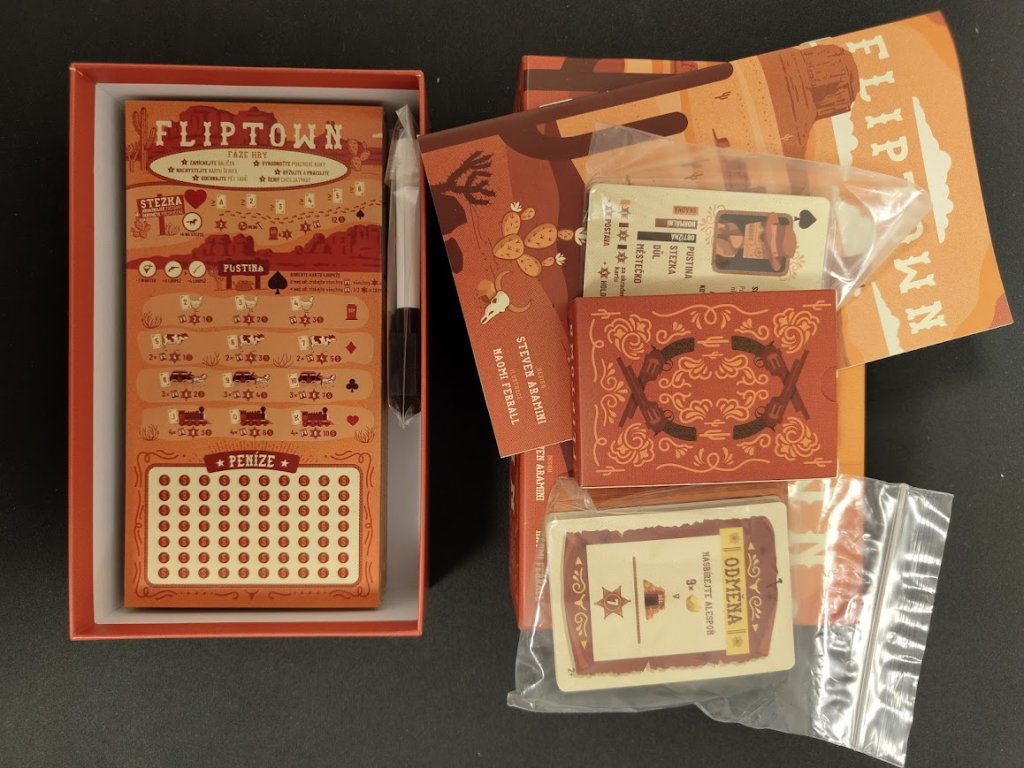 Fliptown je hra typu flip and write (otoč a zapiš), ve které se snažíte získat hvězdy (vítězné body) prozkoumáváním Fliptownu, městečka divokého západu. Hra je ovládána balíčkem klasických pokerových karet, jejichž kombinace zapisujete suchými fixy na svoji hráčskou desku, mapu Fliptownu a jeho okolí.