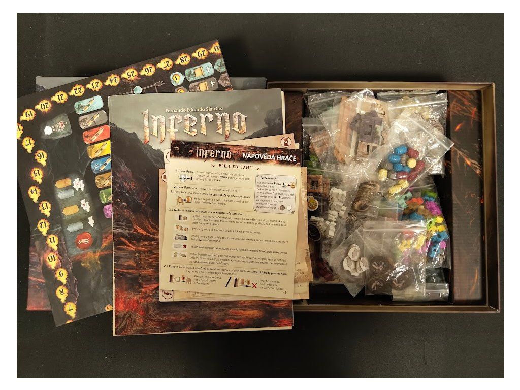 Inferno (české vydání) je strategická hra inspirovaná Božskou komedií Danta Alighieriho, ve které povedete svůj rod ve snaze stát se co nejlepšími přisluhovači pekla. Toho dosáhnete sbíráním bodů prohnanosti. Ty získáte především za to, že dovedete hříšníky do příslušných kruhů v pekle. V průběhu hry se budou hráči střídat na tahu po směru hodinových ručiček, dokud Dante nezapříčiní konec hry. Herní plán se skládá ze dvou částí: jedna zobrazuje všech 9 kruhů pekla a rejstřík duší, zatímco druhá představuje Florencii na počátku 14. století, kde Dante žil, s jejími mocenskými hrami a palácovými intrikami.
