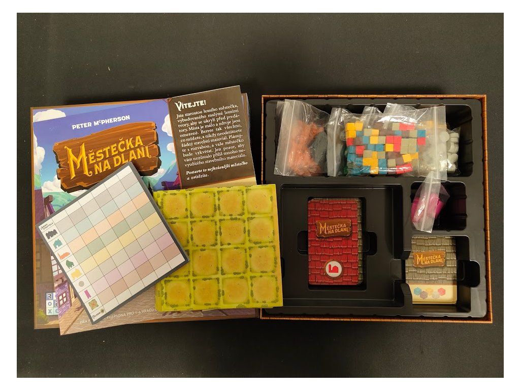 Ve hře Městečka na dlani je Vaše město reprezentováno hrací plochou 4x4, na kterou umísťujete kostky surovin v určité kombinaci, abyste postavili budovy. Každá budova přináší vítězné body za něco jiného. Když žádný hráč již nemůže umístit suroviny nebo postavit budovu, hra končí. Pole bez budov přinášejí postih. Hráč s nejvíce body vyhraje.