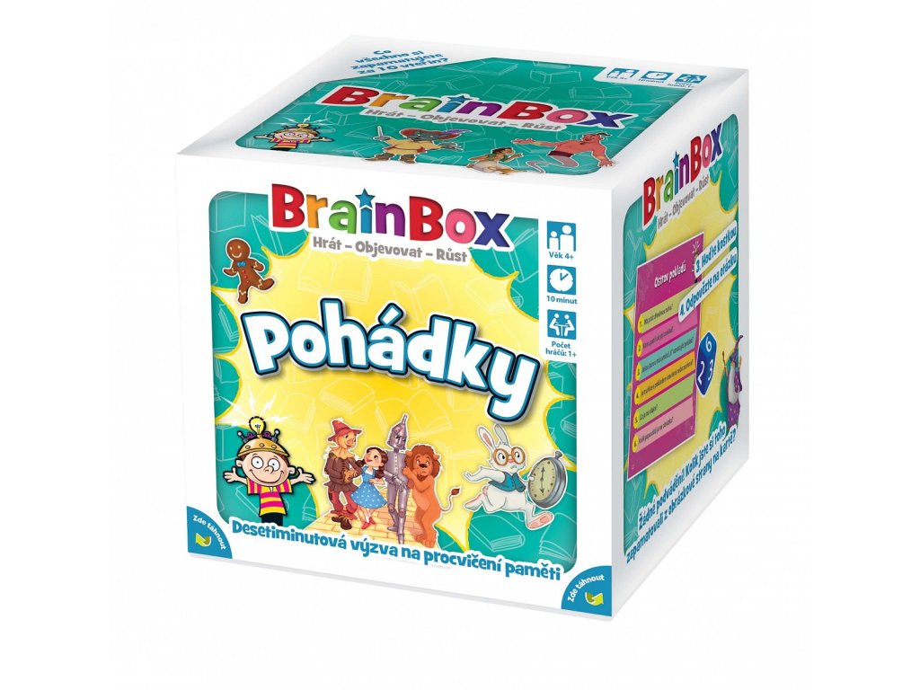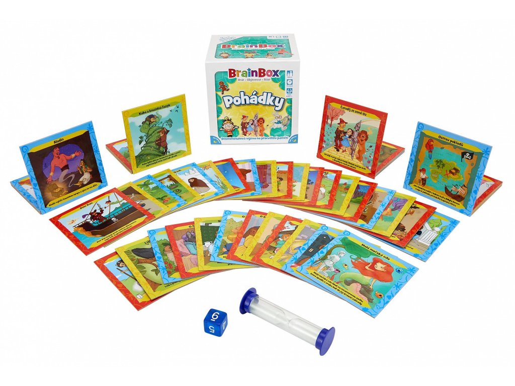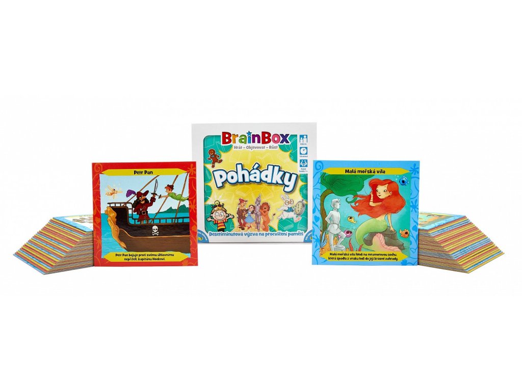 BrainBox Pohádky obsahuje 55 ručně malovaných karet, které představují klasické pohádky nebo příběhy pro děti spolu s krátkým textovým úryvkem. Pohádky vám doslova ožijí před očima. Můžete se těšit na Aladina, Malou mořskou vílu, Prince Bajaju, Čaroděje ze země Oz a mnoho dalších.
