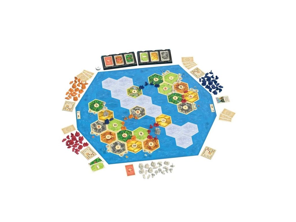Hra obsahuje: 11 dílů pevniny, 19 dílů moře, 6 dílů rámu, 7 destiček divů Catanu, 10 destiček přístavů, 10 žetonů s čísly, 73 žetonů, 6 přehledů stavebních nákladů, 60 lodí ve 4 barvách (každá po 15), 1 figurku piráta a pravidla.