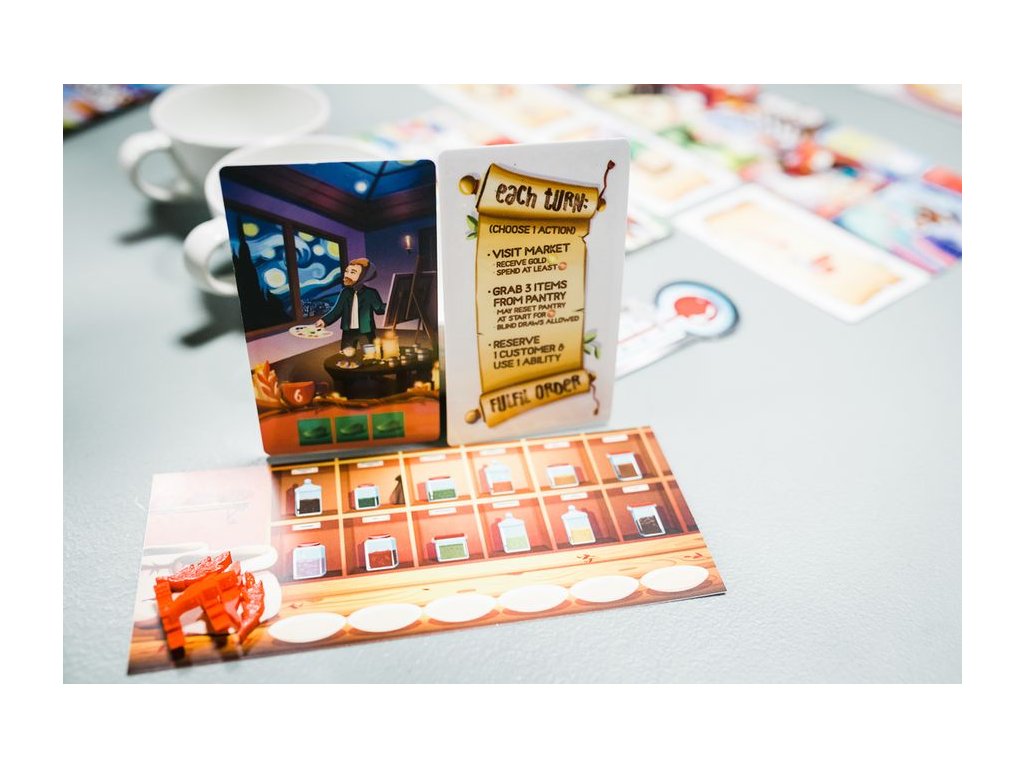 Zarezervujte zákazníka - Hráč si může také rezervovat zákaznickou kartu ze zákaznické skupiny. Hráč nemůže mít v krabičce s čajem více než 3 nevyplněné zákaznické karty. Pokud má hráč více než 3 karty, je karta zahozena a umístěna lícem nahoru do skupiny zákazníků s měděnou mincí z peněženky umístěné nahoře.