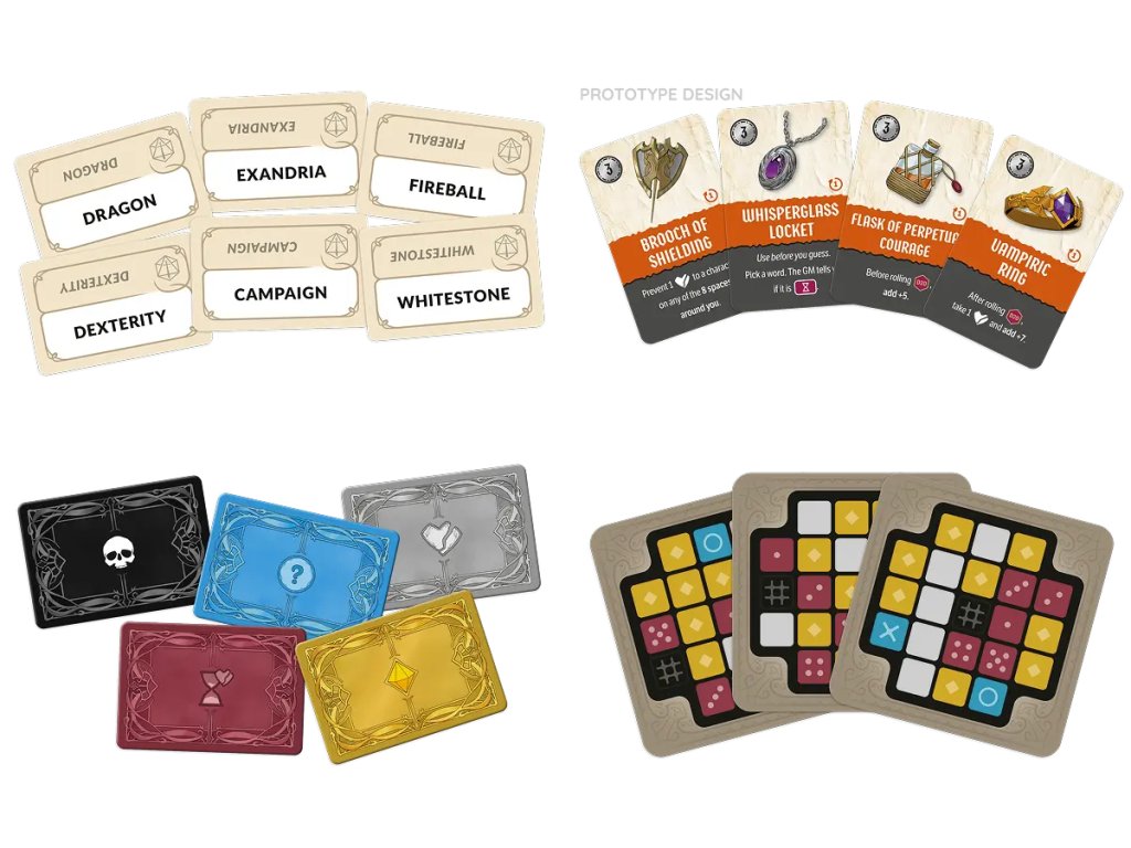 Hratelní hrdinové mají své vlastní kartonové miniatury, které se během hádání umisťují na slova. Každý hrdina má také osobní schopnosti, které se odemykají, jak hráči sbírají XP z úspěšných misí, a mohou si vybavit předměty, které lze zakoupit během hry. Pro sledování XP, HP, postupu postav a předmětů má každá postava svůj vlastní charakterový list. A ano, v krabici je zahrnutý i D20, protože postavy musí projít svými vlastními jedinečnými testy dovedností, které určují, jak dobře (pokud vůbec) jsou jejich schopnosti vykonávány.