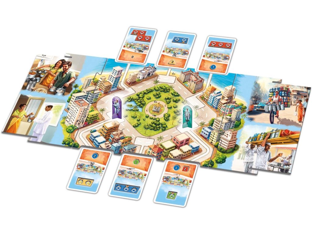 • Fáze vyzvedávání: Střídavě pohybujte svým Dabba Wallou po Bombaji a sbírejte karty dabba. Pokaždé, když vezmete kartu, zahrajete jednu ze tří karet, které máte v ruce, abyste získali zobrazenou dlaždici dabba – polyomino o 1–4 čtvercích – a umístili ji do svého vozíku, kde dlaždice skládáte stále výš a výš, jak kola postupují. Dabby jsou ve čtyřech barvách a musíte je umístit na rovné povrchy, případně vyplnit mezery prázdnými dabby. Pokud spojíte dva symboly polovičního chai na dlaždicích na stejné úrovni, vytáhnete náhodnou dlaždici chai s bonusovou akcí. Všechny hrané karty dabba si ponechte ve svém osobním odhazovacím balíčku.