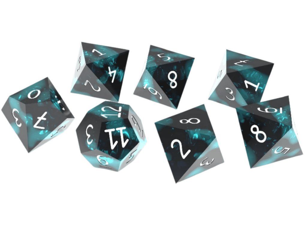 Sada 7 resinových kostek nahrazujících akrylátové kostky ve hře Dějiště: Divoký hvozd.