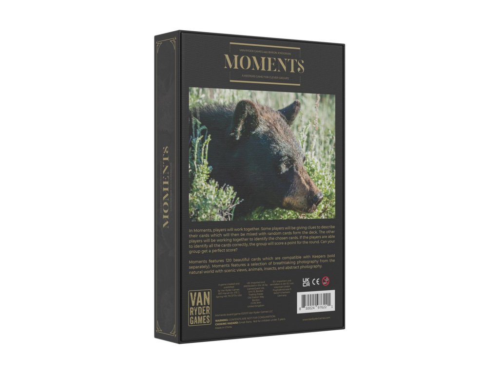 Ve hře Moments budou hráči spolupracovat. Někteří hráči budou dávat nápovědy k popisu svých karet, které budou poté zamíchány s náhodnými kartami z balíčku. Ostatní hráči budou spolupracovat na identifikaci vybraných karet. Pokud se hráčům podaří správně identifikovat všechny karty, skupina získá bod za dané kolo. Dokáže vaše skupina dosáhnout perfektního skóre? Moments obsahuje 120 krásných karet, které jsou kompatibilní s hrou Keepers (prodává se samostatně).
