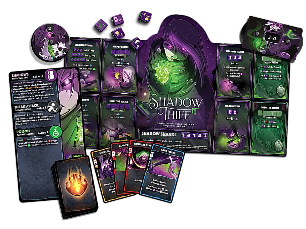 Díky svým lstivým schopnostem a speciálním kostkám Stínový zloděj otravuje, vyhýbá se útokům a manipuluje s bojištěm. Každý hod přivádí jeho nepřátele blíže ke zkáze, zatímco útoky ze zálohy a přetrvávající jedy je kolo za kolem oslabují. Vstupte s ním do temnoty, ale buďte opatrní: jediné světlo, které uvidíte, bude záblesk jeho čepele.