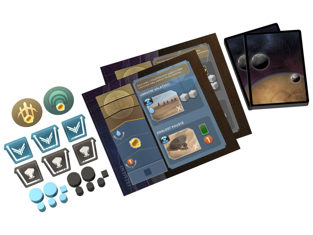 - 75+ dřevěných žetonů zdrojů