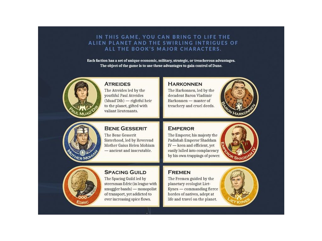 V DUNE se stanete vůdcem jedné ze šesti mocných frakcí. Každý si přeje ovládat nejcennější zdroj ve vesmíru - melanž, tajemné koření, které se na planetě DUNE nachází jen za nemalou cenu. Melanž je jedinečný a má skutečné geriatrické vlastnosti. A bez melanže by cestování nebylo možné. Pouze po požití této návykové drogy může Guild Steersman i nadále prožívat vize budoucnosti, což jim umožní vytyčit bezpečnou cestu hyperprostorem.