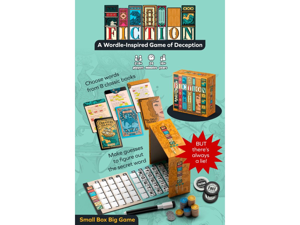 Fikce je hra inspirovaná slovní hříčkou. Jeden hráč je lhář a vybere si tajné slovo z klasického literárního díla. Ostatní hráči budou jako tým používat logiku a gramotnost, aby co nejrychleji odvodili tajné slovo.