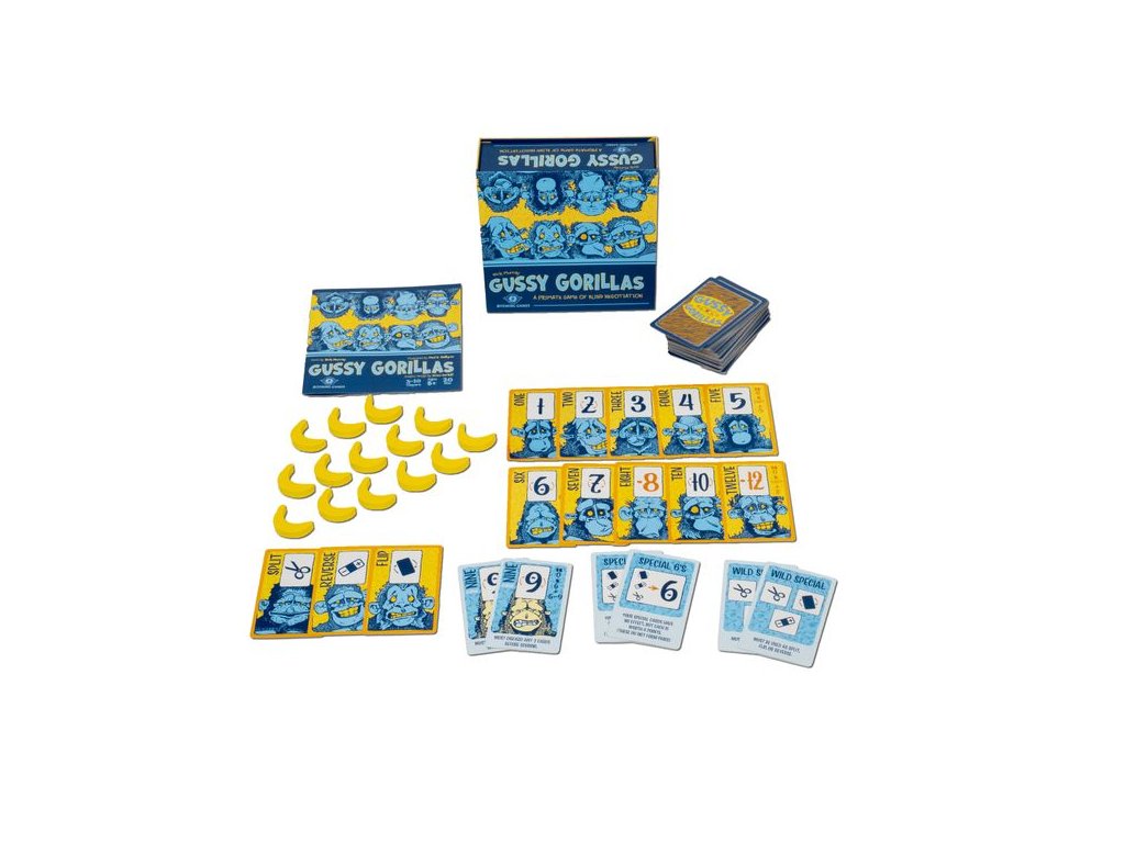 Podobně jako v populární hře Hanabi drží hráči v Gussy Gorillas své karty otočené od sebe... ale místo kooperativní paměťové hry se jedná o soutěživou hru založenou na vyjednávání a blafování. Věci se stanou ještě zajímavějšími, jakmile si hráči uvědomí, že každá karta může být pro jejich sbírku buď velmi dobrá, nebo velmi špatná, v závislosti na kontextu. Pokud chcete zvítězit, budete muset přesvědčit své soupeře, aby si špatné karty nechali pro sebe a ty dobré dali vám...