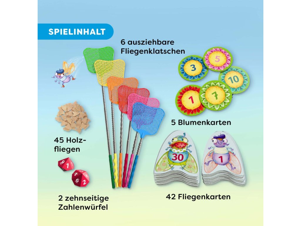 6 mucholapek, 42 karet s mouchami, 5 karet s květinami, 45 dřevěných much, 2 desetistranné kostky s čísly, 1 návod ke hře.