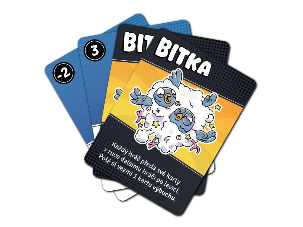 Karta Bitka donutí všechny hráče poslat své karty sousedovi. Chilli odpraví holuba, pokud je na něj zahrána další modrá karta krmení, a Limča má sice hodnotu -2, ale váš holub vybouchne až při 5 různých barvách krmení.
