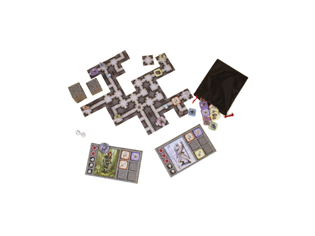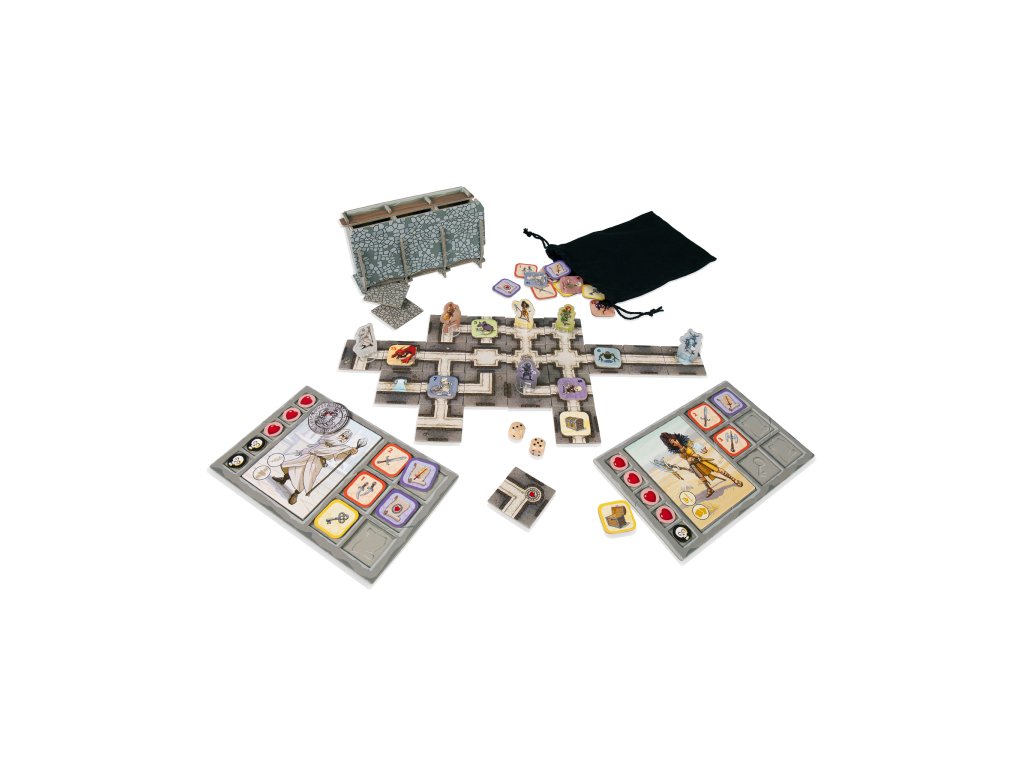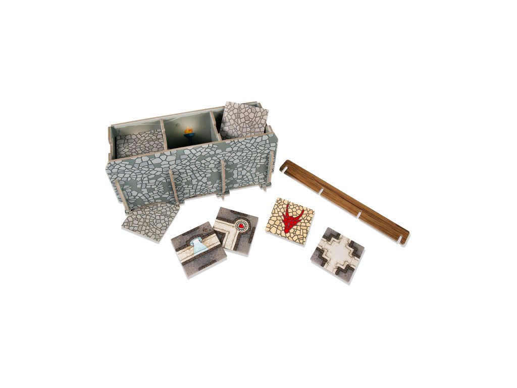 80 destiček katakomb, 6 kartonových figurek hrdinů se stojánky, 6 karet hrdinů, 5 desek inventáře, 25 žetonů životů, kartonovou věž na dílky, plastový insert, neprůhledný sáček na nestvůry a poklady, 43 žetonů nestvůr, 10 žetonů truhel, 2 hrací kostky, 1 žeton prokletí a pravidla hry (v češtině, slovenštině, polštině a rumunštině).