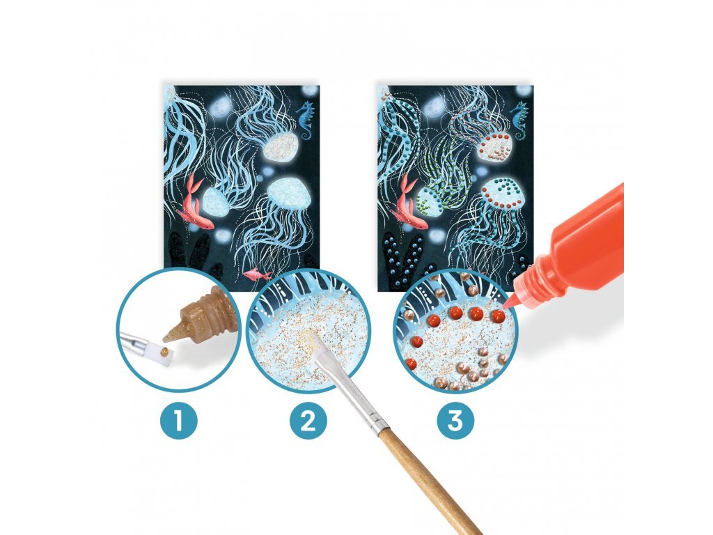 Děti si vyzdobí čtyři krásné zvířecí ilustrace speciálními barvami, které umožňují tvořit vystouplé tečky, čárky i třpytivé detaily. Mini lahvičky se dobře drží, aplikátory přesně vedou barvu a štětec pomůže vyzkoušet další efekty i vyplnit větší plochy. Výsledné obrázky mají originální plastický vzhled a nádhernou texturu.