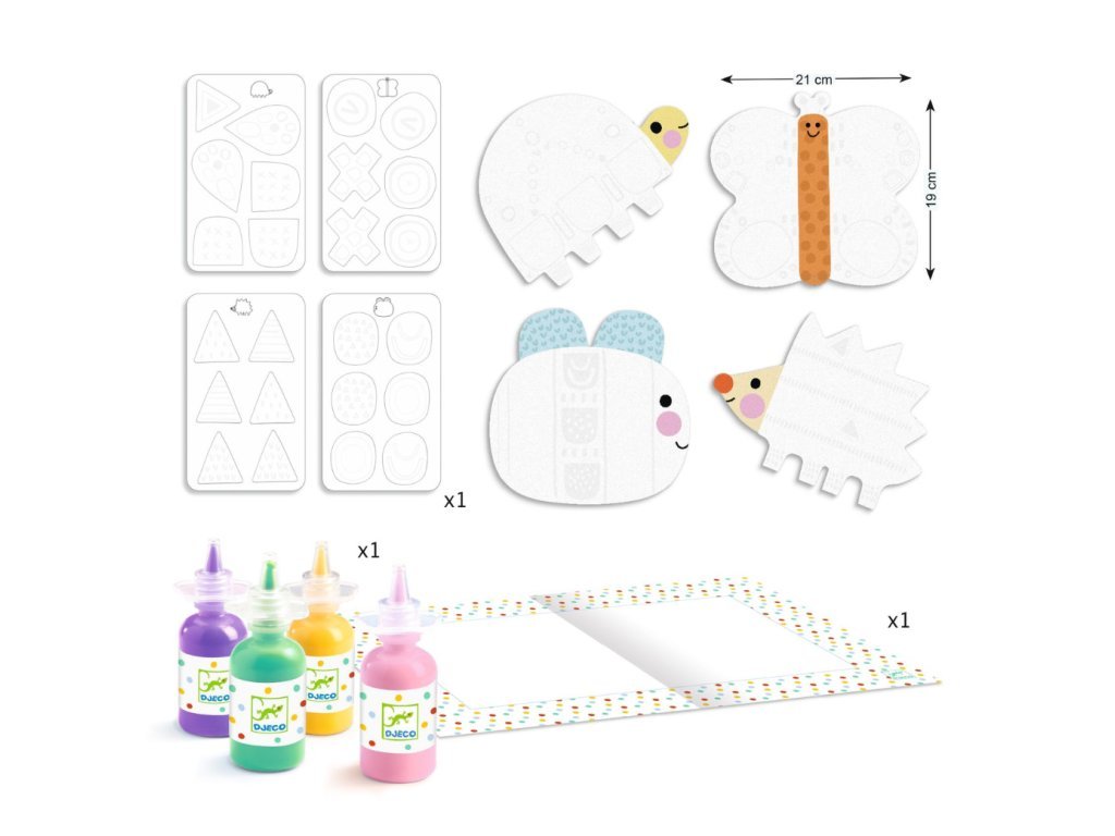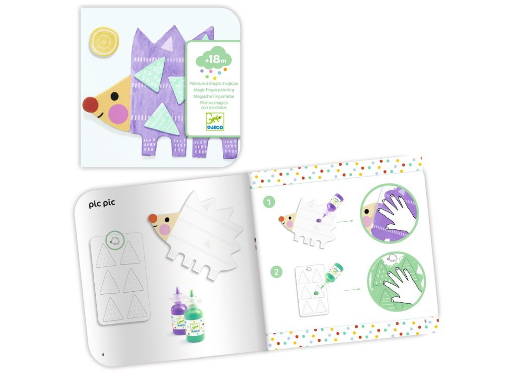 Tvořivá sada, se kterou děti od 18 měsíců objeví kouzlo prstových barev. Stačí pár kapek barvy a na zvířátkách se začnou objevovat kouzelné vzory. Nakonec je mohou děti ozdobit samolepkami a dodat jim ještě roztomilejší vzhled. Sada obsahuje i praktickou papírovou podložku, takže tvoření je snadné a bez nepořádku. Skvělý způsob, jak se hravou formou seznámit s barvami a tvary.