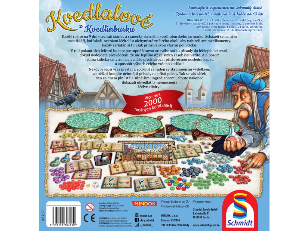 Každý rok se na 9 dní otevírají stánky a stánečky slavného kvedlinburského jarmarku. Scházejí se na něm mastičkáři, kořínkáři, svérázní léčitelé a alchymisté ze širého okolí, aby nabízeli své medikamenty. Každý šarlatán si tu však přihřívá svou vlastní polívčičku. V roli pokoutních felčarů budete postupně losovat ze svého sáčku přísady do léčivých lektvarů, dokud nedojdete přesvědčení, že nic lepšího už ze svých zásob neuvaříte. Ale pozor! Jediná kulička sanytru navíc může představovat příslovečnou poslední kapku a způsobit výbuch celého vašeho kotlíku! Někdy je lepší včas přestat a spokojit se raději se skromnějším výdělkem, za nejž si koupíte účinnejší přísady na příští pokus. Tak se váš sáček den za dnem plní stále silnejšími ingrediencemi, abyste nakonec dokázali ukvedlat ty nejmocnější léčivé elixíry!