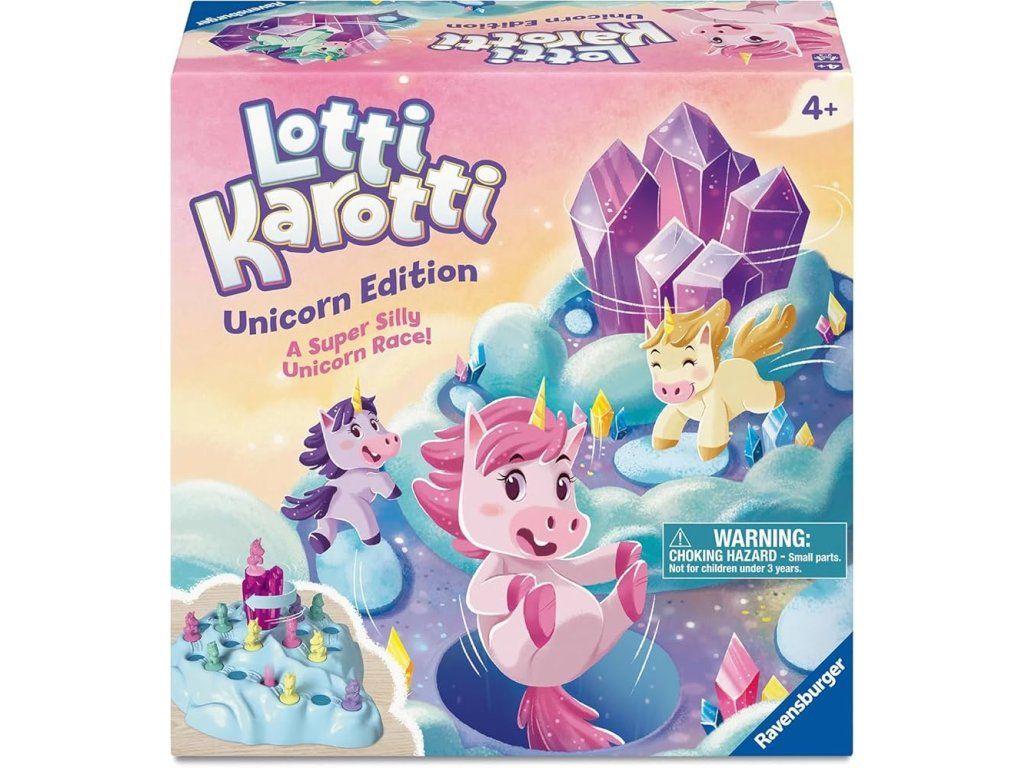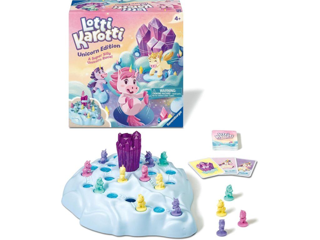 Oblíbená rodinná hra Lotti Karotti přichází v kouzelné edici s jednorožci! Cílem je dostat svého jednorožce k třpytivému krystalu na vrcholu obláčkové hory, ale pozor – při otáčení krystalu se na cestě otevírají díry a jednorožci mohou spadnout! Jednoduchá pravidla, napínavý průběh a roztomilé figurky v pastelových barvách zaručují skvělou zábavu pro děti od 4 let i celou rodinu. Ideální dárek k Vánocům, narozeninám nebo Velikonocům.