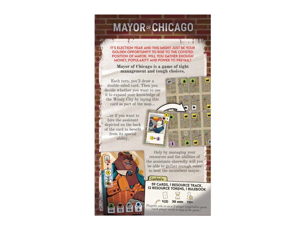 Starosta Chicaga je solitérní hra, ve které jde o pečlivé hospodaření a těžká rozhodnutí. V každém tahu si líznete kartu města a rozhodnete se, zda ji chcete použít k rozšíření svých znalostí o Windy City (položením této karty na mapu), nebo zda najmete asistenta zobrazeného na zadní straně karty, abyste mohli těžit z jeho speciální síly nebo bodovacích schopností. Pouze díky chytrému hospodaření se svými zdroji a silami asistentů budete schopni nasbírat dostatek hlasů k tomu, abyste byli zvoleni.