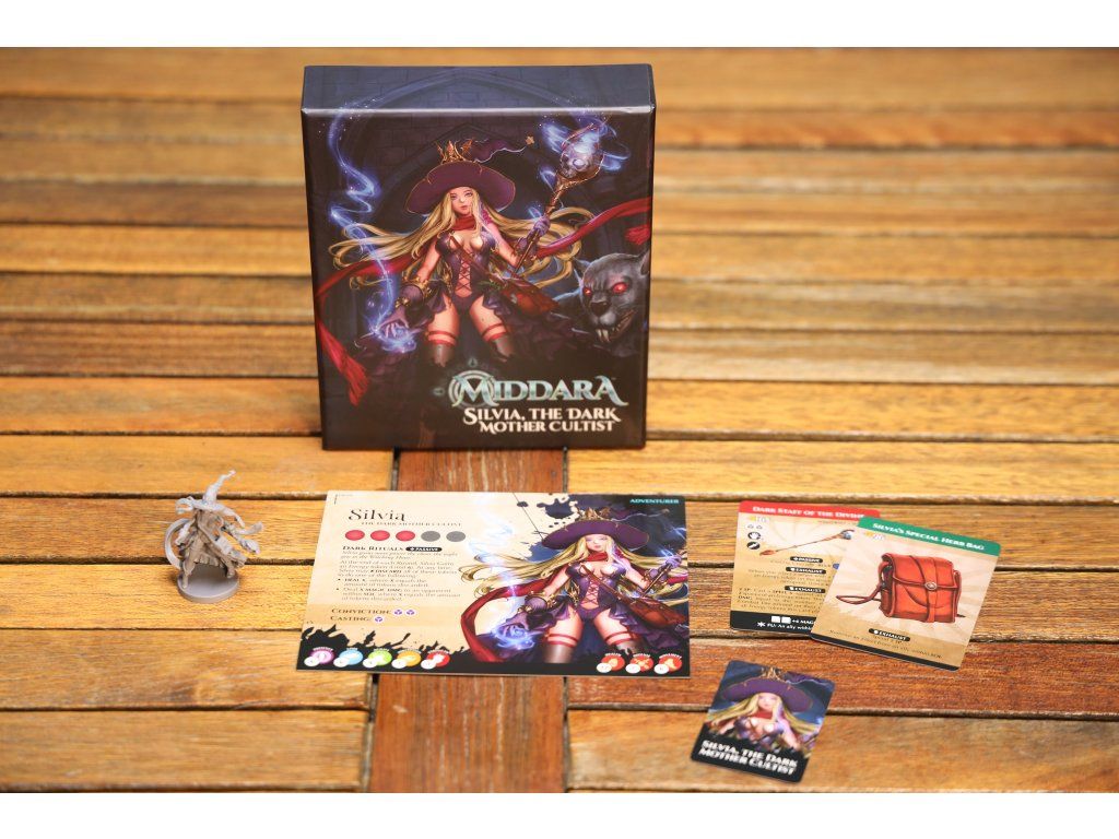 Middara: Silvia, Dark Mother Cultist je promo sada. Obsahuje figurku, kartu dobrodruha, dva unikátní předměty a kartu iniciativy.