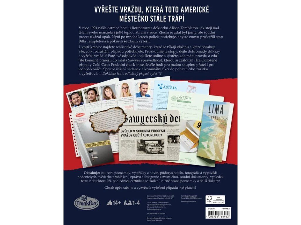 Hra Odložené případy Cold Case: Poslední check-in se skvěle hodí pro malou skupinu přátel i pro jednoho hráče. Spojuje řešení hádanek a kriminální fikci do pohlcujícího zážitku z vyšetřování. Dokážete tento odložený případ vyřešit?
