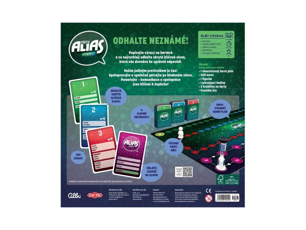 Hra Párty Alias Mystery obsahuje: 1 oboustranný herní plán, 300 karet, 1 figurku, 1 přesýpací hodiny, 3 krabičky na karty a pravidla hry.