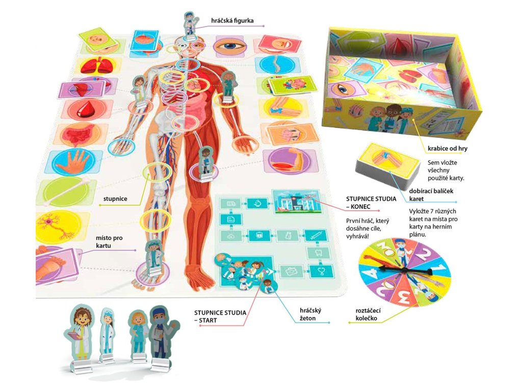 První hráč, který dorazí do cíle, se stane doktorem! Pohybujte svou figurkou po herním plánu, odpovídejte na zábavné otázky o lidském těle a o tom, jak funguje, a sami si vyzkoušejte různé pohyby. Úspěšné zvládnutí úkolů vás posune vpřed na cestě k tomu, abyste se stali doktorem, ale ostatní hráči se budou snažit být ještě rychlejší než vy!