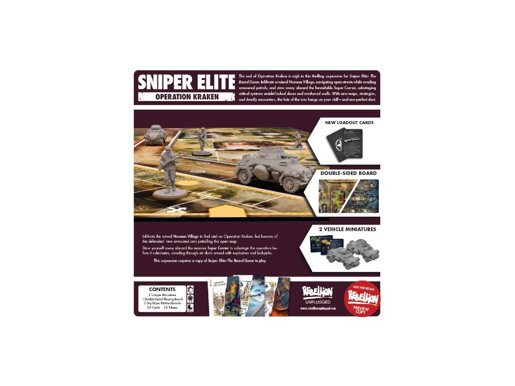 Toto rozšíření pro hru Sniper Elite: The Board Game přináší dvě nové mapy, 2 vozidla s miniaturami, nové karty výbavy a úkolů, tucet nových žetonů a nové karty pro režim pro jednoho hráče.