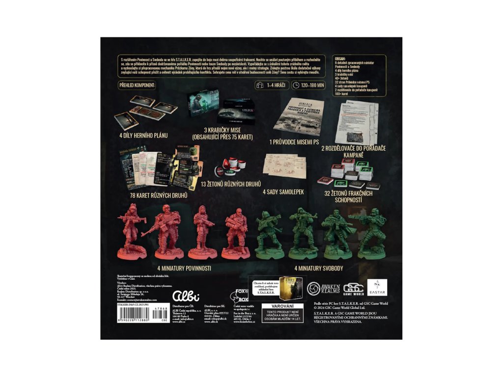 Hra Stalker - Povinnost a svoboda obsahuje: 8 detailně zpracovaných miniatur, 4 díly herního plánu, 3 krabičky misí, více jak 40 žetonů, 32 stran průvodce misemi, 4 sady samolepek kampaně, 2 rozdělovače do pořadače kampaně, více jak 100 karet.