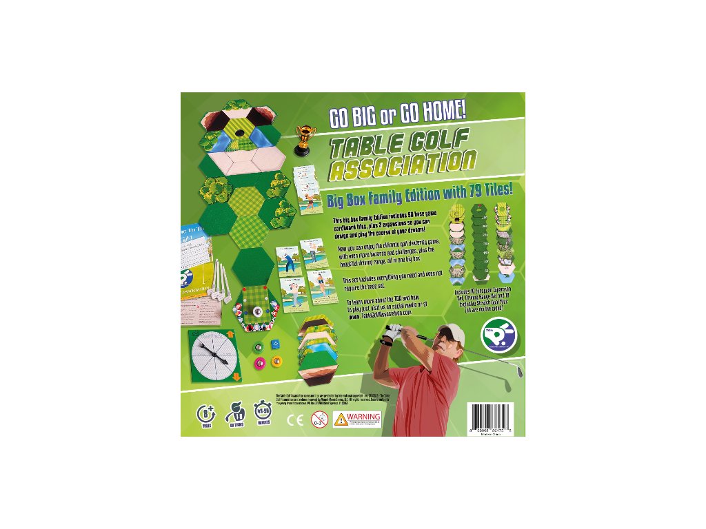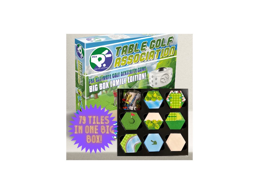 Budeš potřebovat větší stůl!!! Heslo Asociace stolního golfu zní... buď velký, nebo jdi domů! S rodinnou edicí Big Box, která se dodává se 79 oboustrannými silnými kartonovými terénními destičkami, si nyní můžete postavit a zahrát hřiště svých snů.
