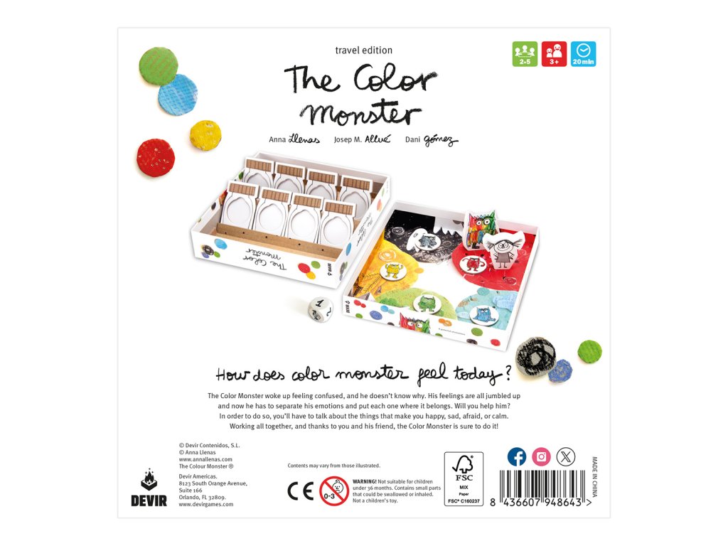 Color Monster je kooperativní desková hra pro děti založená na oblíbené postavě z příběhu Anny Llenas, která pobaví celou rodinu. Hra, kterou navrhli Josep Maria Allué a Dani Gómez, trvá asi 30 minut a je doporučena pro děti od 4 let. Kromě toho, že je to skvělý způsob, jak se pobavit, může být hra také velmi dobrou vzdělávací možností, kde se malé děti naučí rozpoznávat své základní emoce.