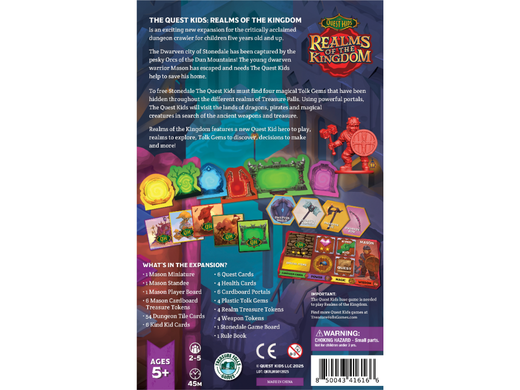 Pro 2–5 hráčů od 5 let Realms of the Kingdom navazuje na tradici Quest Kids v tvorbě vysoce kvalitních fantasy herních zážitků pro mladé hrdiny a jejich rodiny.