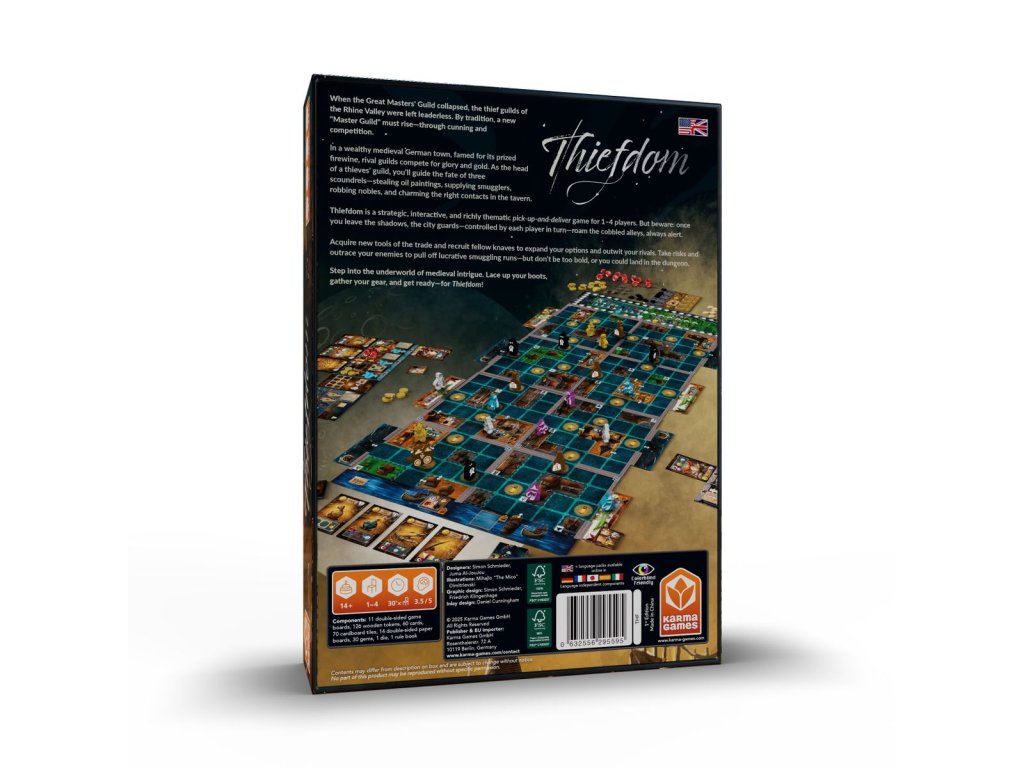 Hra „Thiefdom“, kterou navrhli Simon Schmieder a Juma Al-JouJou, známí díky oceněné hře Clans of Caledonia, nabízí hlubokou strategickou hratelnost s rozsáhlou znovuhratelností. Město ožívá díky modulárnímu a oboustrannému hracímu plánu, který nabízí nové konfigurace a nespočet strategických cest v každé hře. Hra, kterou ilustroval renomovaný umělec The MICO, slibuje bohatý vizuální a tematický zážitek.