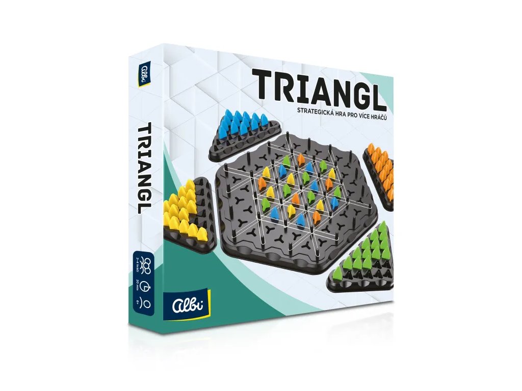 Hra Triangl obsahuje: 1 hrací plán, 1 sadu gumiček, 4 sady hracích kamenů.