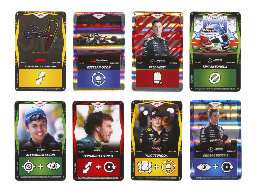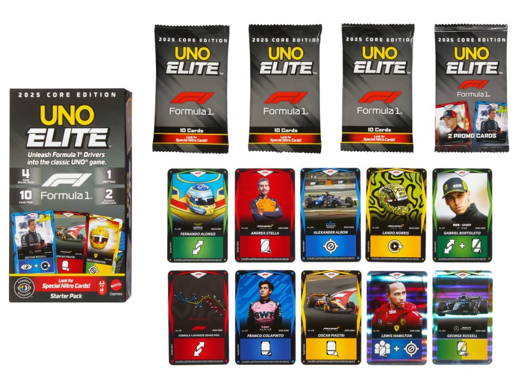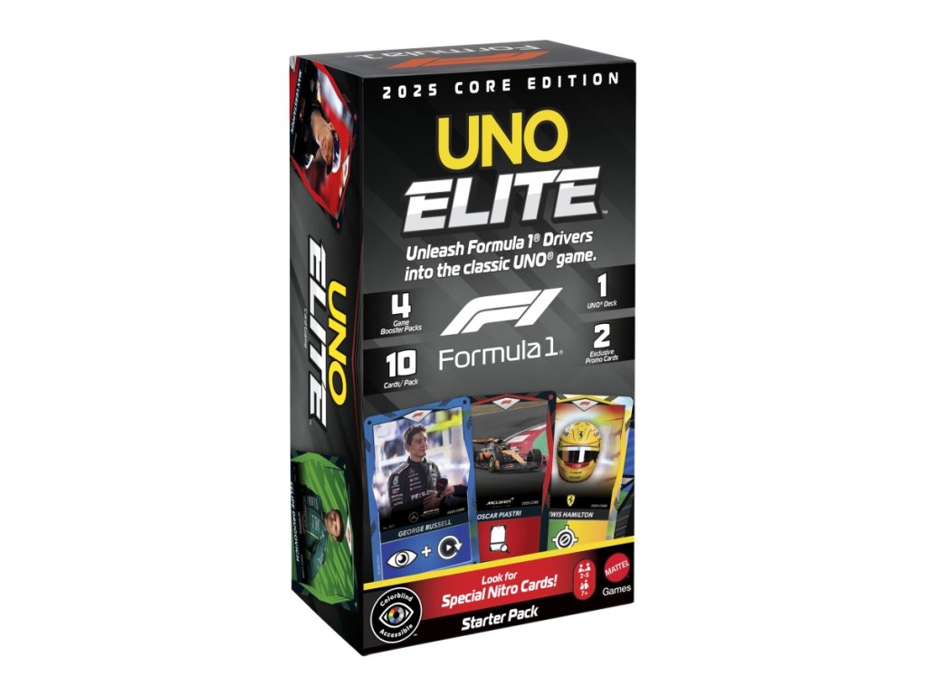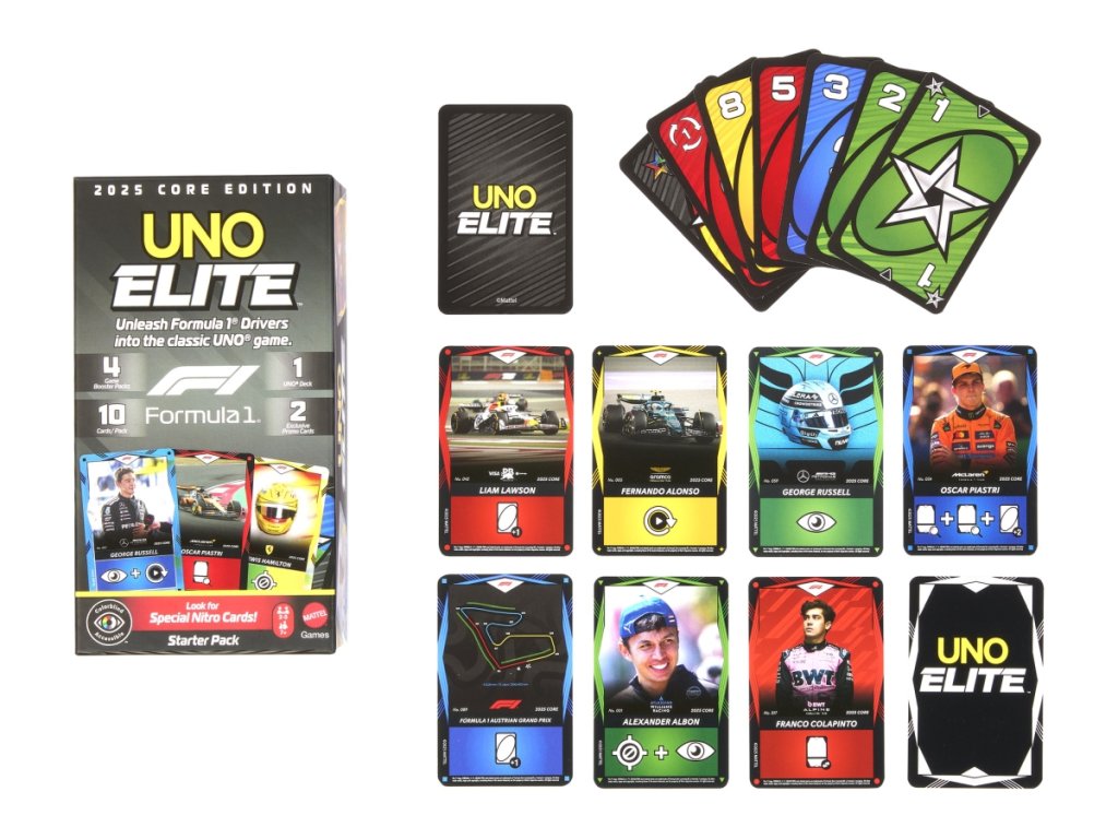 Tradiční hra UNO kombinuje speciální karty Akční karta elitních jezdců, které zobrazují jezdce, auta i helmy ze světa Formule 1. Zařaďte tyto karty do svého týmu a přidejte tak do klasické hry vzrušující nové akce. Barvy a vzhled výrobku se mohou lišit. Určeno pro 2-5 hráčů. Věk 7+