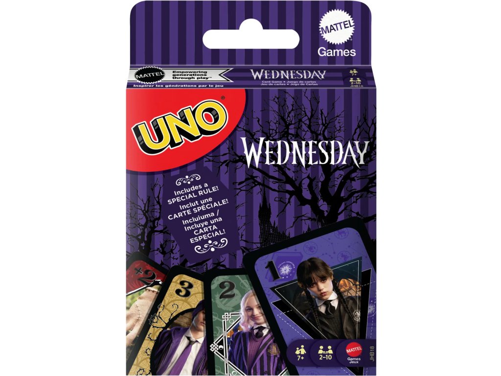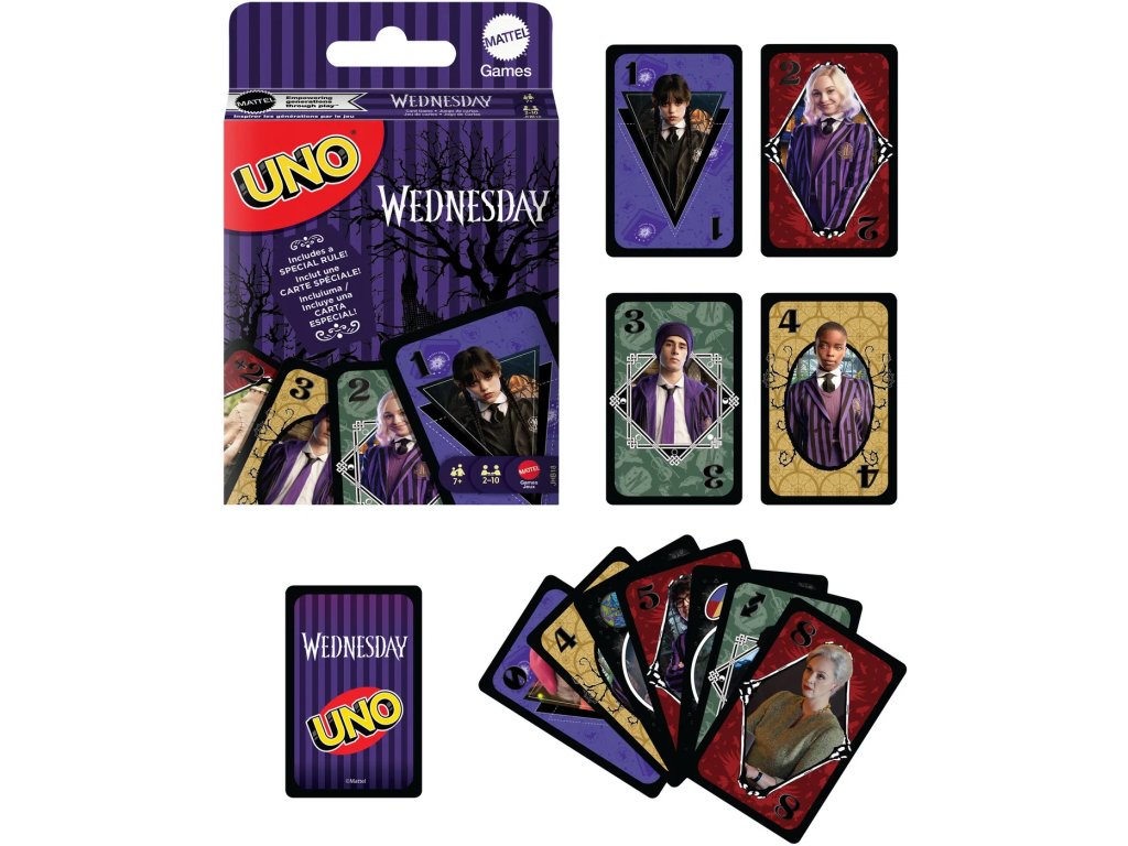 UNO Wednesday - Klasická hra, kterou znáte a máte rádi, s motivy z strašidelného seriálu Wednesday, která navíc obsahuje speciální pravidlo! A když vám zůstane poslední karta, nezapomeňte křičet UNO! Skvělý dárek pro fanoušky seriálu Wednesday a milovníky karetních her.