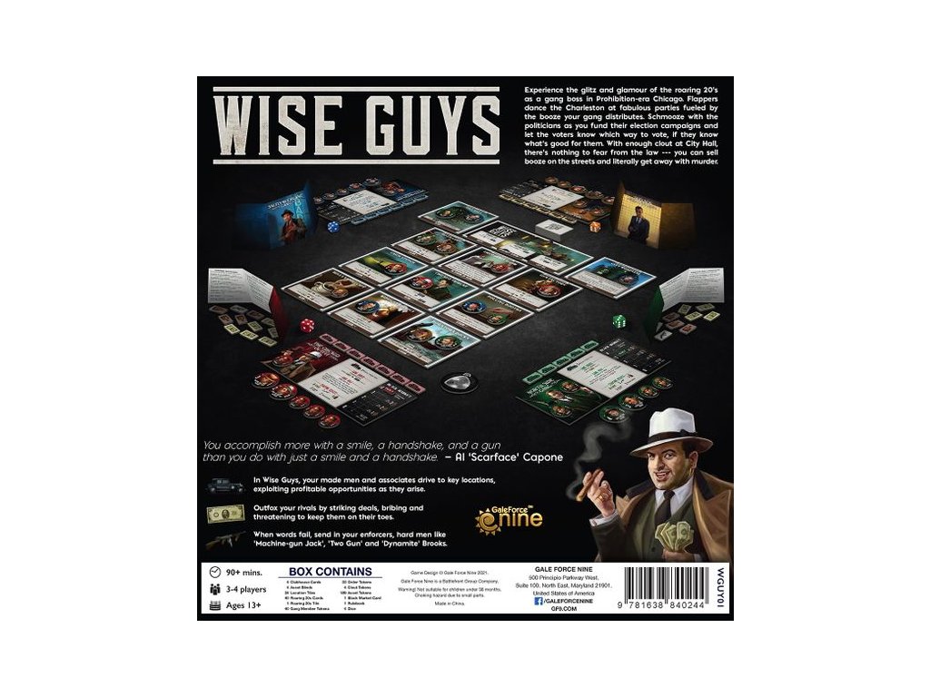 Wise Guys je rychle naučitelná desková hra, ve které hrajete za jeden ze čtyř soupeřících gangů, které se snaží zbohatnout jako "Rum Runners" v drsných ulicích Chicaga na vrcholu bouřlivých 20. let.