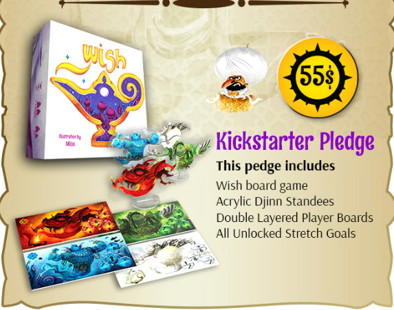 Ve hře Wish, je vaším cílem nasbírat co nejvíce vítězných bodů. Toho dosáhnete tak, že budete plnit karty přání pomocí nashromážděných krystalů a přiřazovat je k meeplům přejících osob odpovídajících barev. Pomocí nasbíraných meeplů postavte monumenty a splňte kartu Osudu. Procházejte tímto kouzelným světem s přesností, využívejte své mistrovství v ovládání karet přání, monumentů a cílů Osudu, abyste zvítězili jako nejúspěšnější džinové.