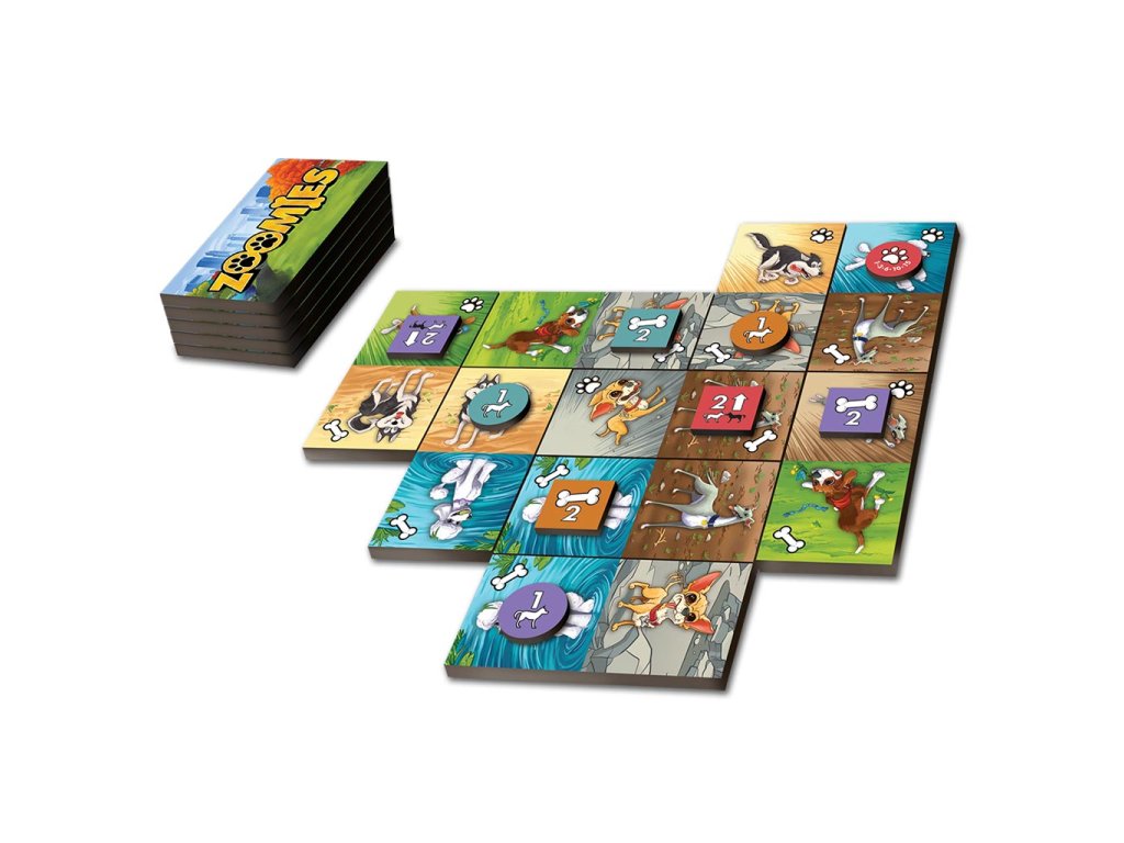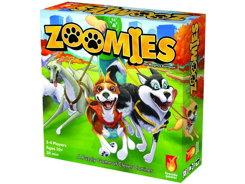 Ve hře Zoomies jste venčitel psů, který pomáhá štěňátkům v parku najít si kamarády, sbírat kosti, stát se vůdcem smečky a získat zoomies. V každém tahu umístěte do hracího pole dlaždici ve stylu domina a poté na ni umístěte bodovací žeton. Každý ze čtyř bodovacích žetonů lze hrát dvěma způsoby, takže si musíte vybrat, co je nejlepší a čeho se vzdát. Žetony vám dávají body na základě sousedících psů, ikon kostí a dalších prvků.