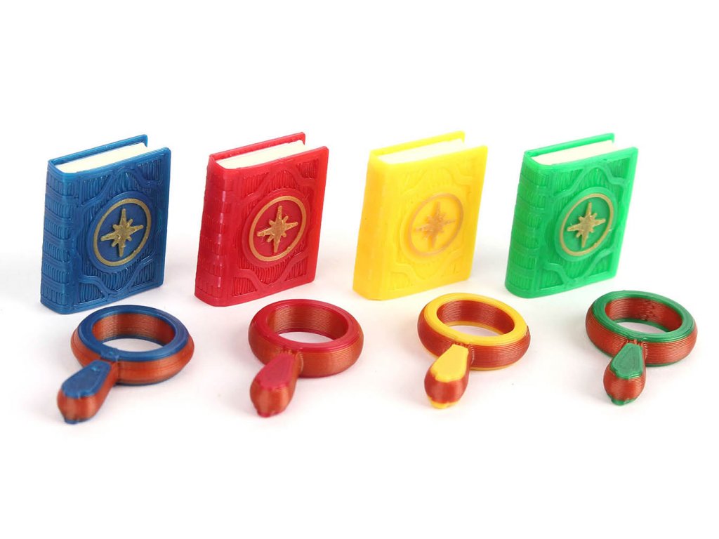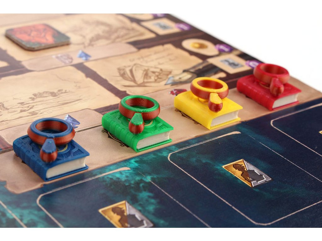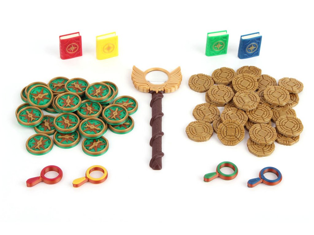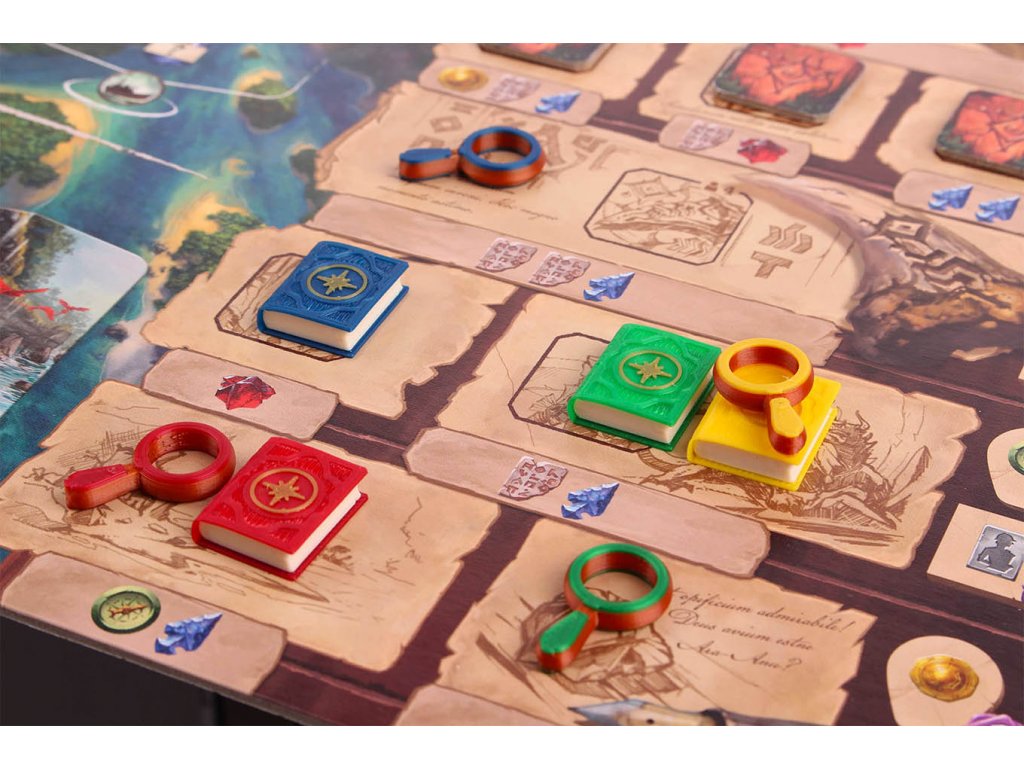 Na svých nebezpečných cestách po ostrově Arnak by jsme měli být dobře vybaveni. Sada žetonů pro jednotlivé hráče - 4x lupa, 4x deník.