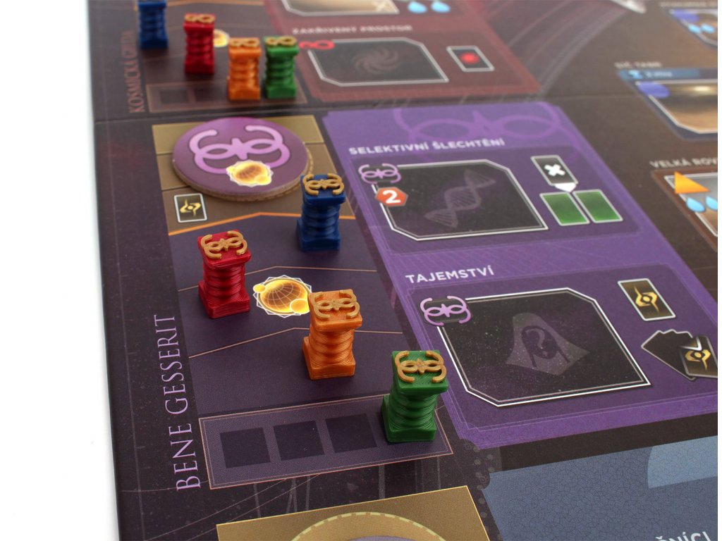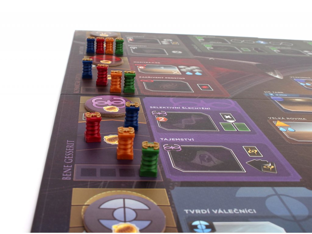 Ukazatele vlivu na stupnice frakcí Bene Gesserit, Kosmické gildy, Fremeny a Imperátora. Žetony nahrazují původní dřevěné kostičky.