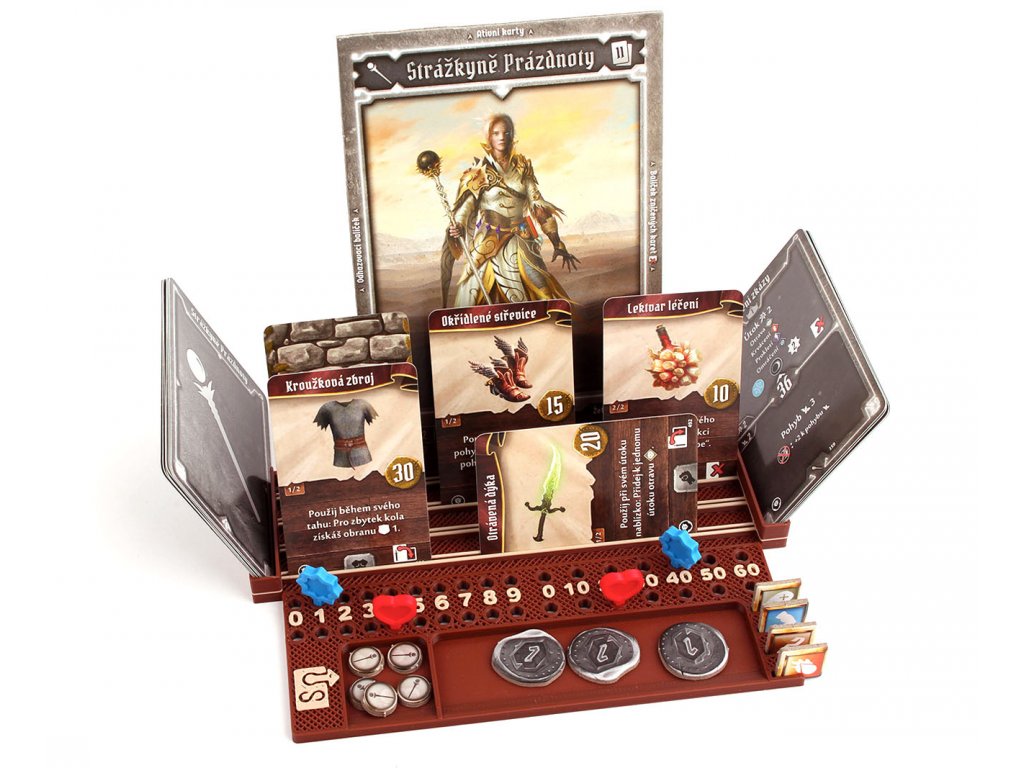 Na deskách jsou počítadla životů a zkušeností i s tematickými ukazateli, slot pro destičku postavy, 2 sloty pro odhozené a zničené karty, drážky pro karty vybavení a předmětů (popř. úkolů). Přední část slouží pro uložení zlata, žetonů postav a stavů.