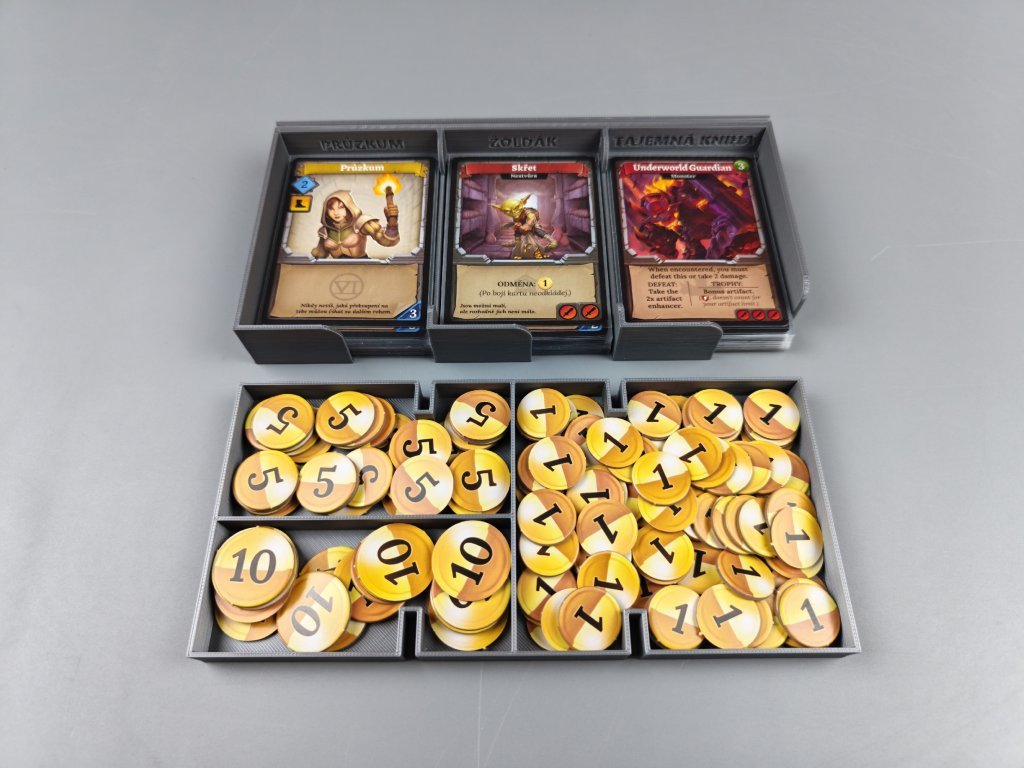 Kompatibilní insert s hrou: Hrdinové Hlubokého HvozduInsert je vytištěný pomocí 3D tiskárny, je navržen tak, aby všechny komponenty skvěle zapadly, ale aby se i dobře vyndavaly. Navíc je tento insert navržen i pro obalené karty. Zrychluje přípravu, sklízení (o několik minut) ale i průběh hry a umožňuje bezpečnější skladování herních komponent.