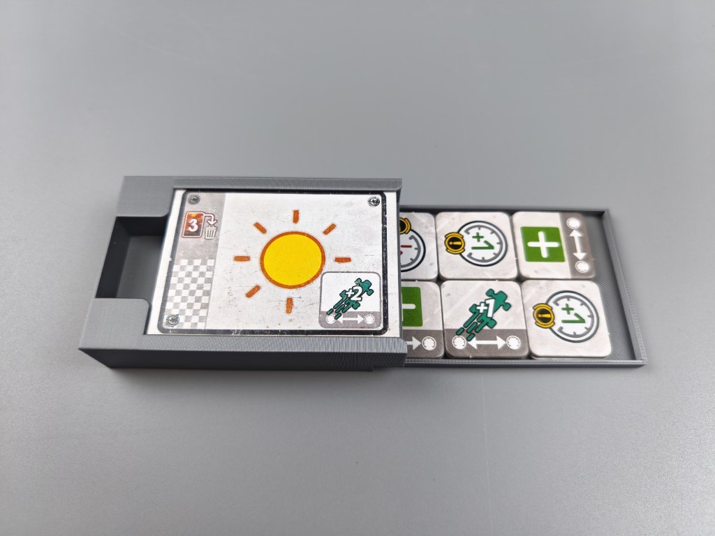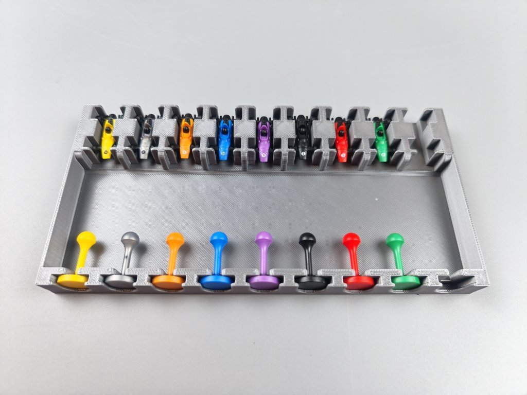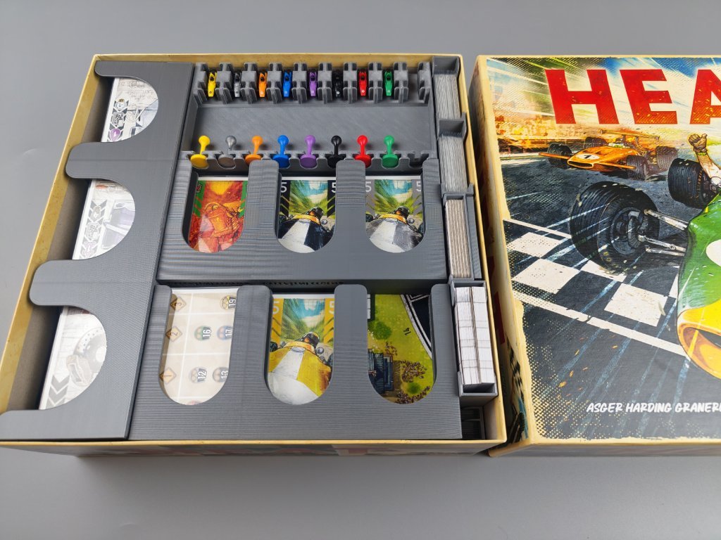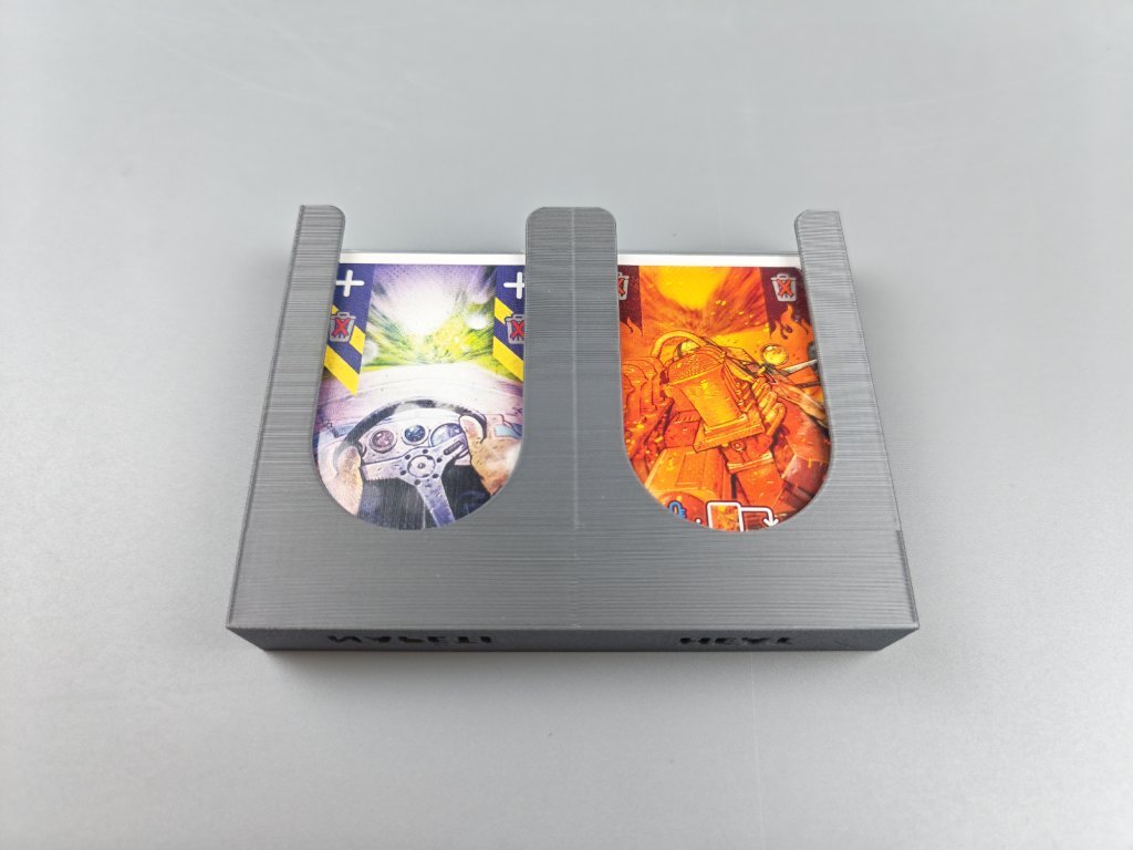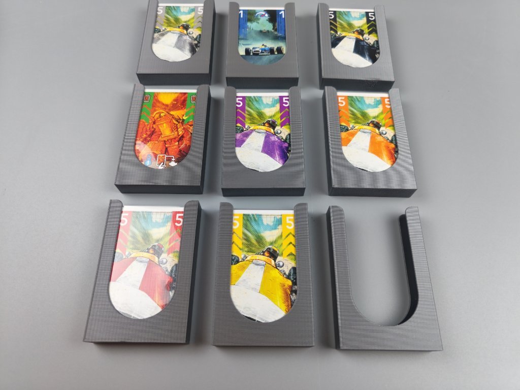 Stojany na karty pro hru Heat jsou ve tvaru připomínající spoiler, barevné provedení doplňuje hru a jejich velikost odpovídá limitu karet v ruce. V kombinaci s převodovkou tvoří ideální set pro každého závodního šílence. Materiál: PLA