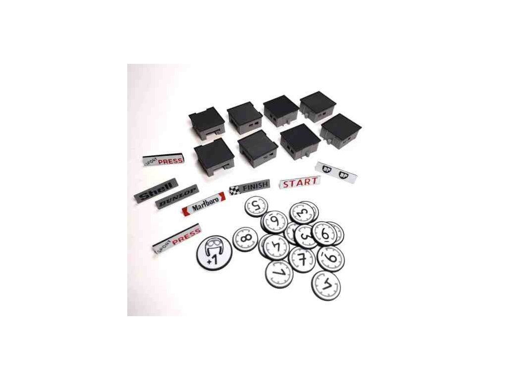 - 16 oboustranných žetonů modifikací zatáček pak slouží k překrytí symbolu rychlosti v zatáčce, když je ovlivněna žetonem změny rychlosti