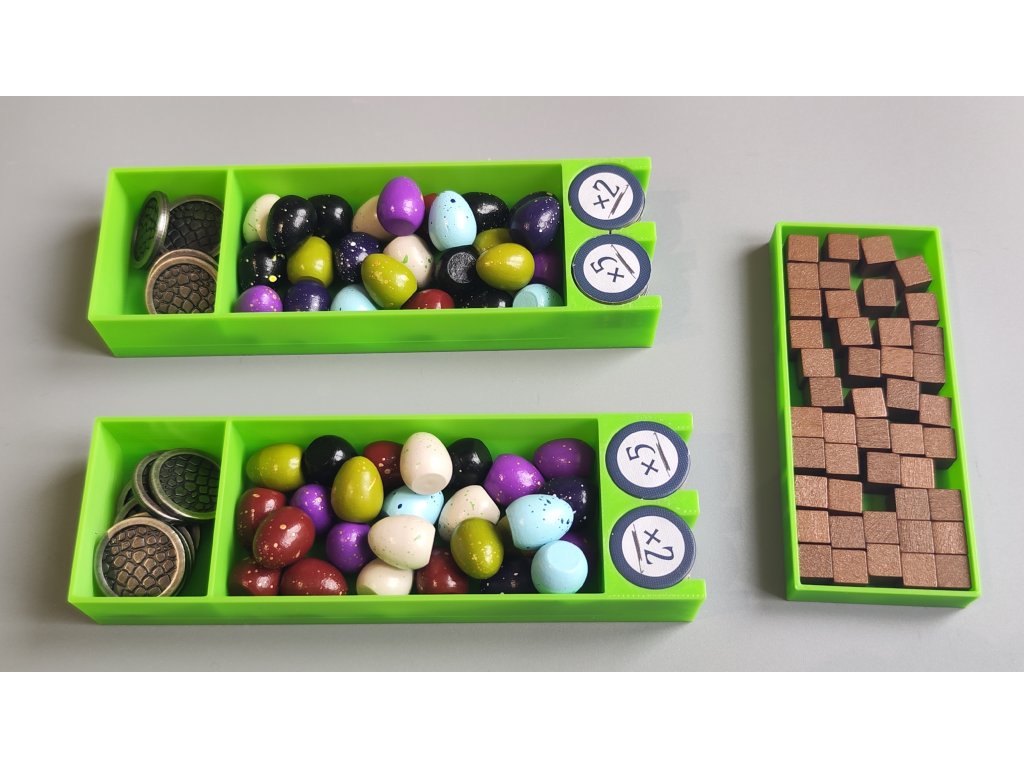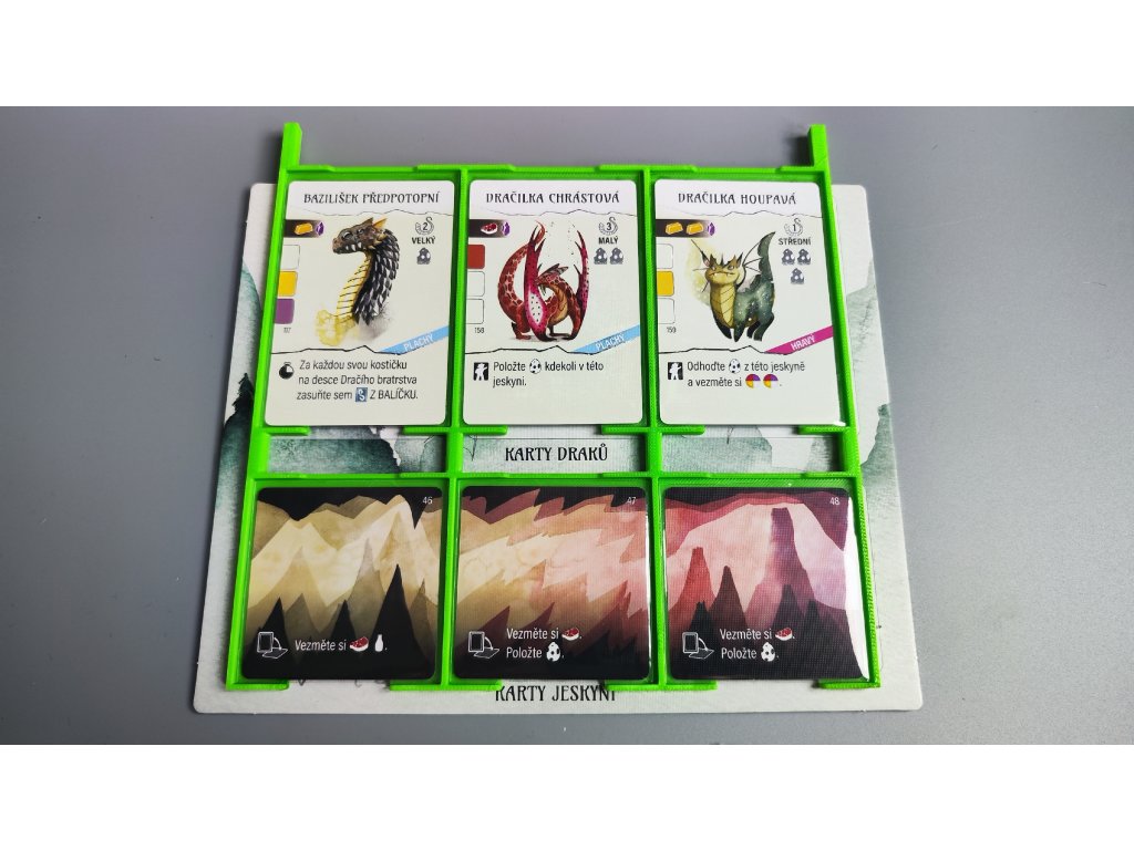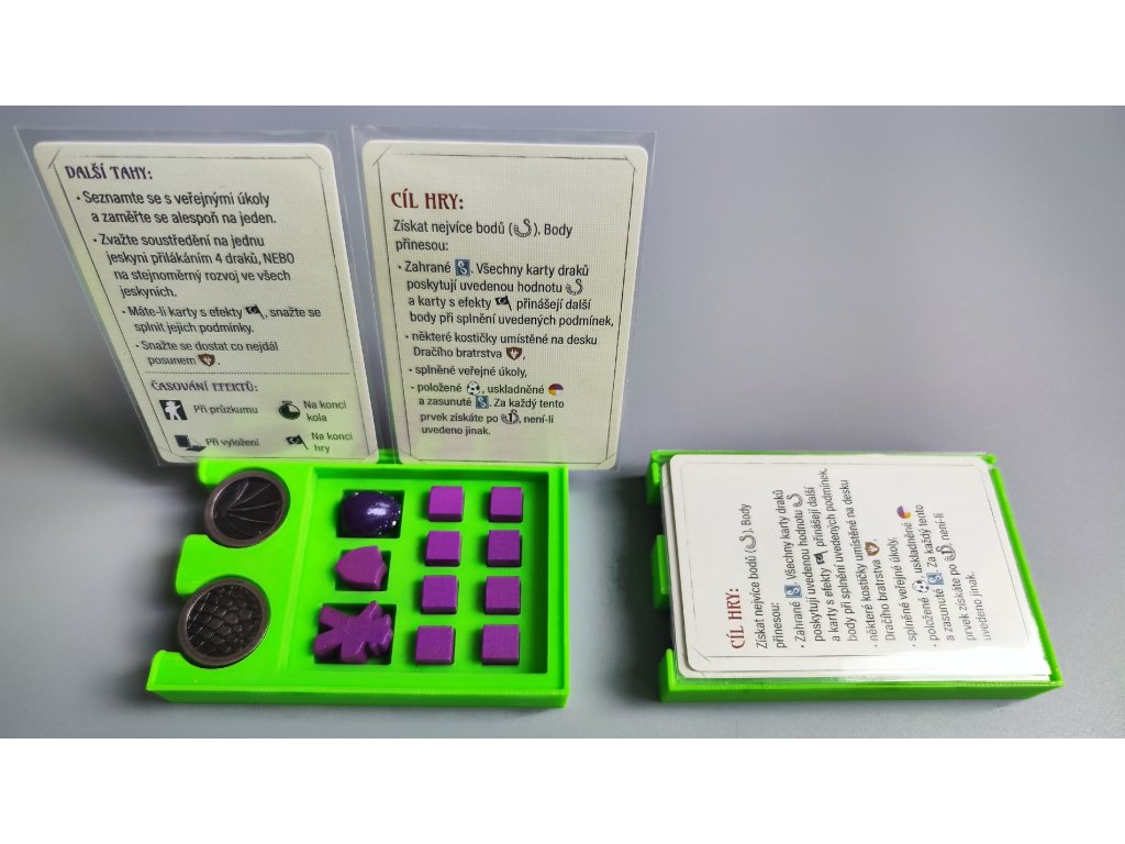 - 5x společnou krabičku na setup hráče (2x lama karta, 1x dračí vejce, 1x kámen dračího bratrstva, 8x označovací kostičku, 1xfigurku průzkumníka a 6x minci)