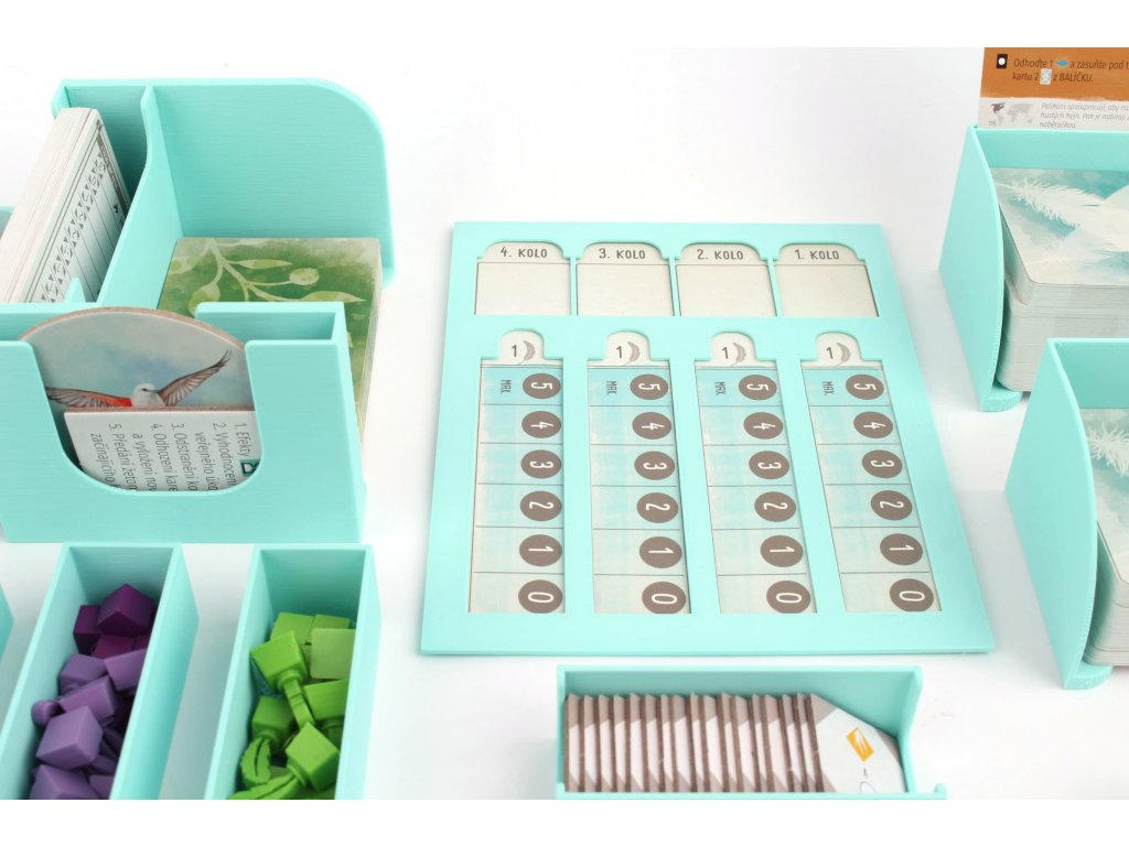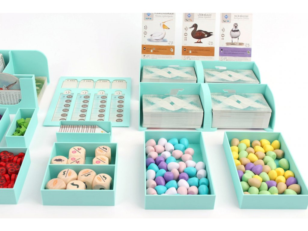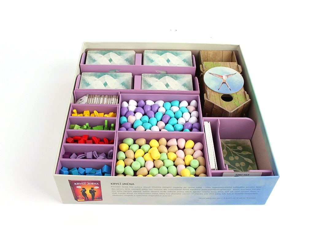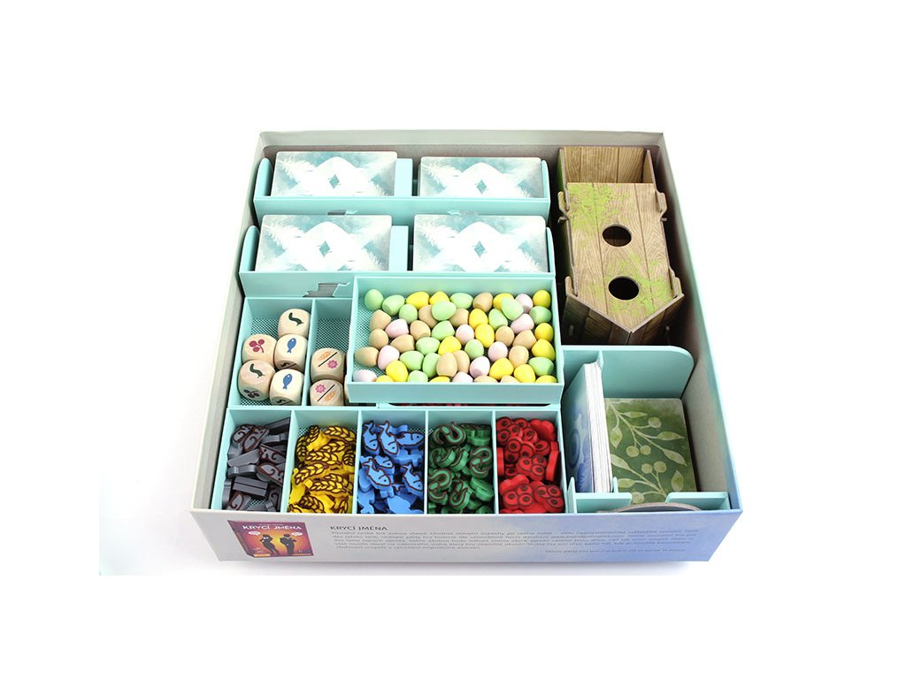 Dimenzováno na 5 hráčských desek. Veškeré karty se vejdou i s obaly, pořadače jsou navržené tak, že se z nich dají karty rovnou jednoduše dobírat, a díky mírnému skosení dna nehrozí riziko rozsypání při sebemenším drcnutí. Jeden z pořadačů má zabudovaný stojan na 3 karty ptáků v nabídce, karty v něm stojí pod mírným úhlem, což usnadňuje hráčům čtení jejich efektů. Součástí insertu je také overlay na kartu veřejných úkolů. Krabičky na potravu, nektar a akční kostičky pojmou také 3D variantu těchto žetonů (na ilustračním foto je 5x30 žetonů potravy a 69 žetonů nektarů).