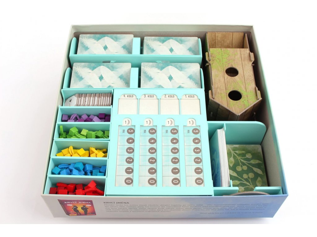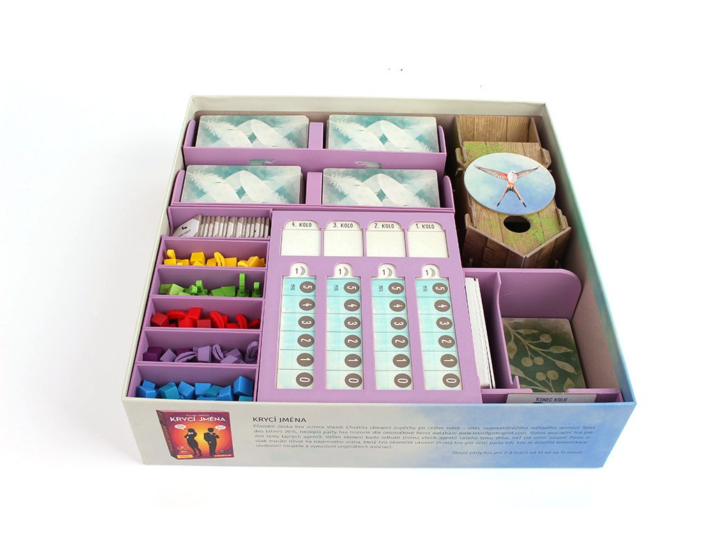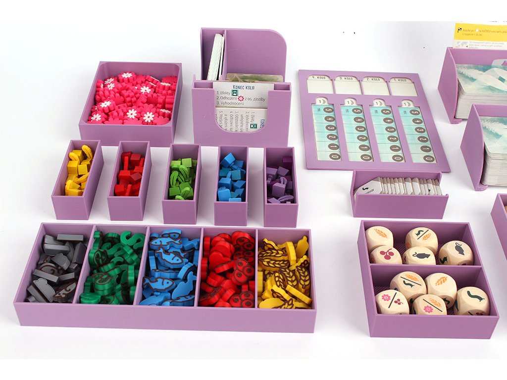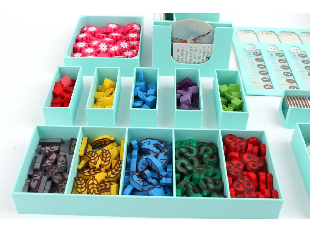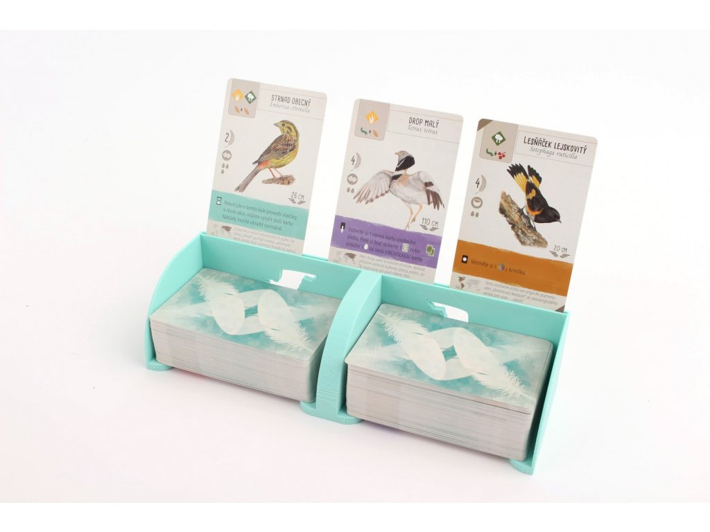 Dimenzováno na 5 hráčských desek. Veškeré karty se vejdou i s obaly, pořadače jsou navržené tak, že se z nich dají karty rovnou jednoduše dobírat, a díky mírnému skosení dna nehrozí riziko rozsypání při sebemenším drcnutí. Jeden z pořadačů má zabudovaný stojan na 3 karty ptáků v nabídce, karty v něm stojí pod mírným úhlem, což usnadňuje hráčům čtení jejich efektů. Součástí insertu je také overlay na kartu veřejných úkolů. Krabičky na potravu, nektar a akční kostičky pojmou také 3D variantu těchto žetonů (na ilustračním foto je 5x30 žetonů potravy a 69 žetonů nektarů).