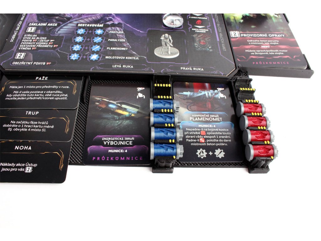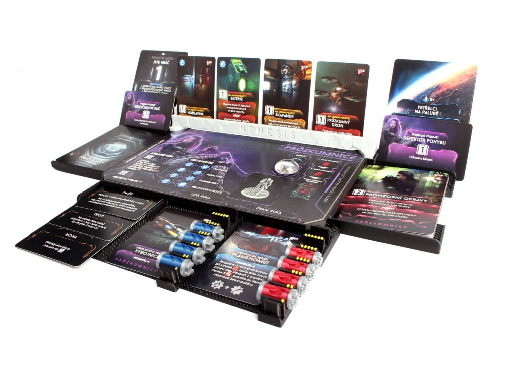 Dashboard je složen ze 4 částí. Spodní část obsahuje sloty pro 3 velké karty vážného zranění, 2 sloty pro zbraň (levá a pravá ruka). U malých karet zbraní je část, kam lze vložit původní červené kostičky nábojů nebo naše Nemesis zásobníky. Levá a pravá část slouží pro dobírací a odhazovací balíček a navíc jsou obě vybaveny sloty pro karty počátečních předmětů, karty úkolů a pomocnou kartu. Do vrchního oddílu se vkládá panel hráče a plastový držák na karty předmětů.